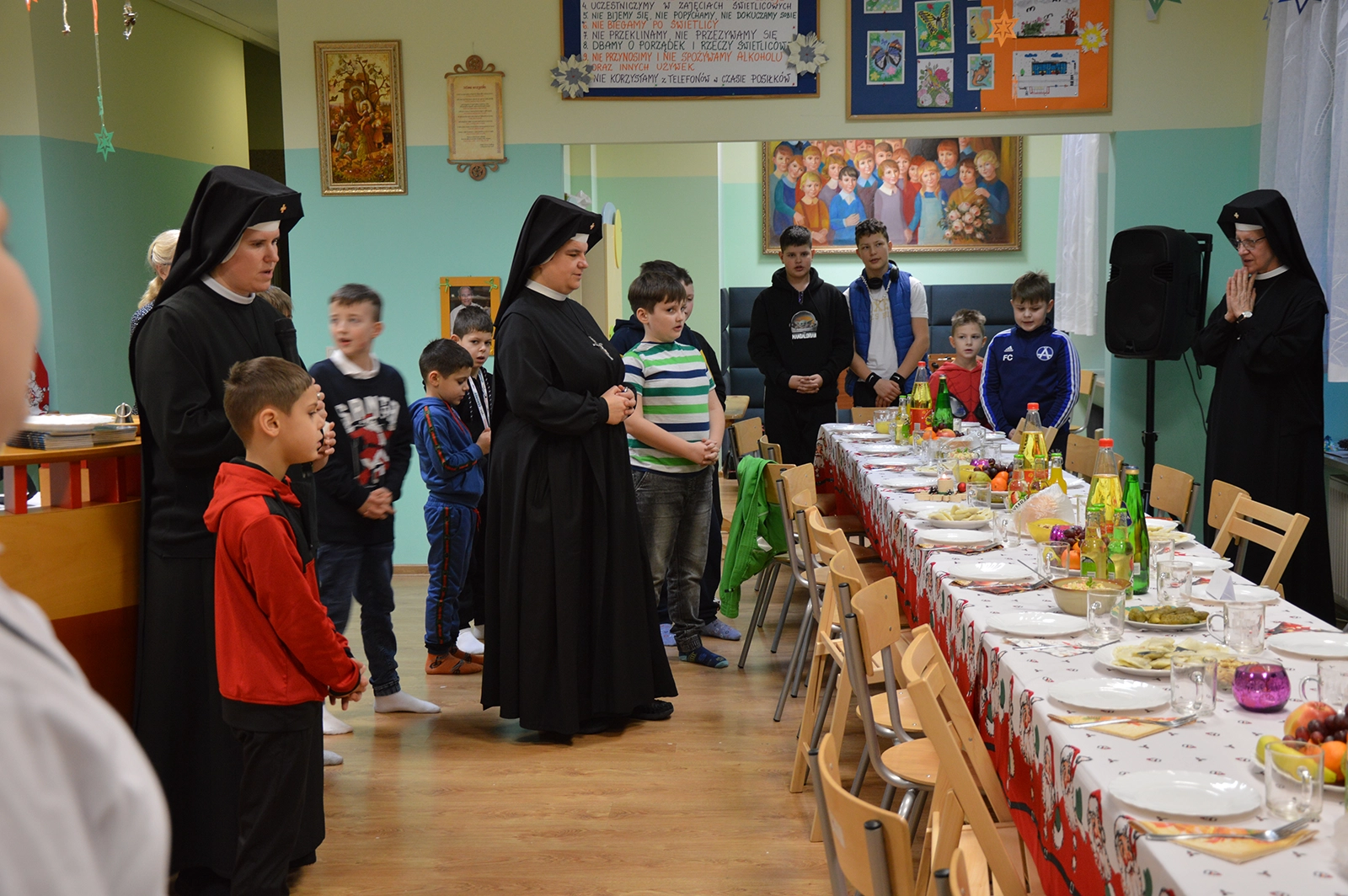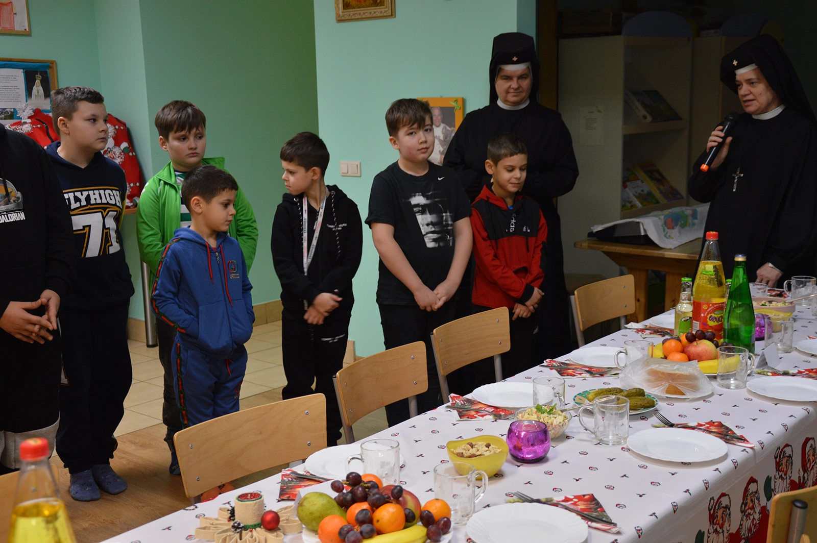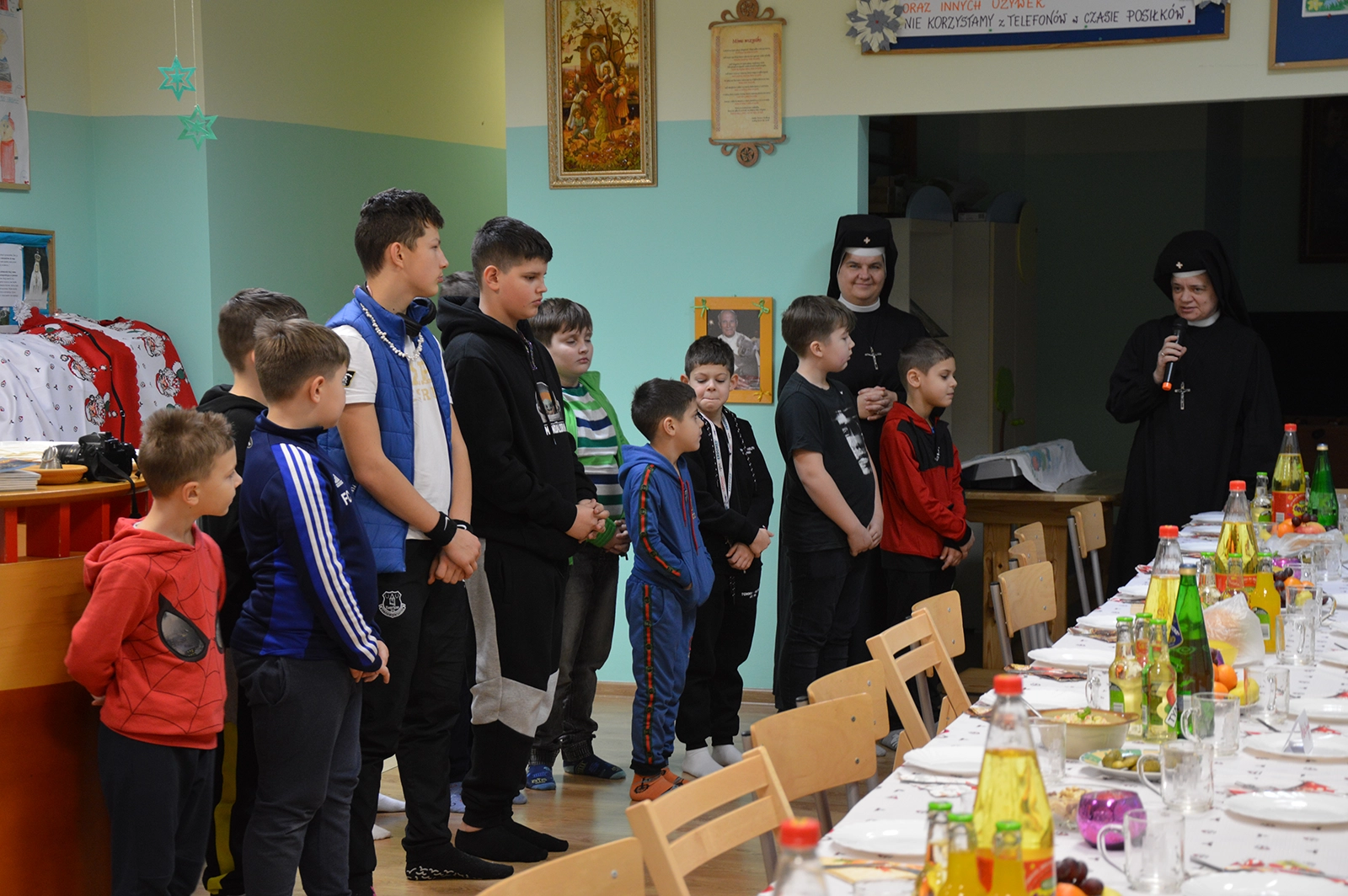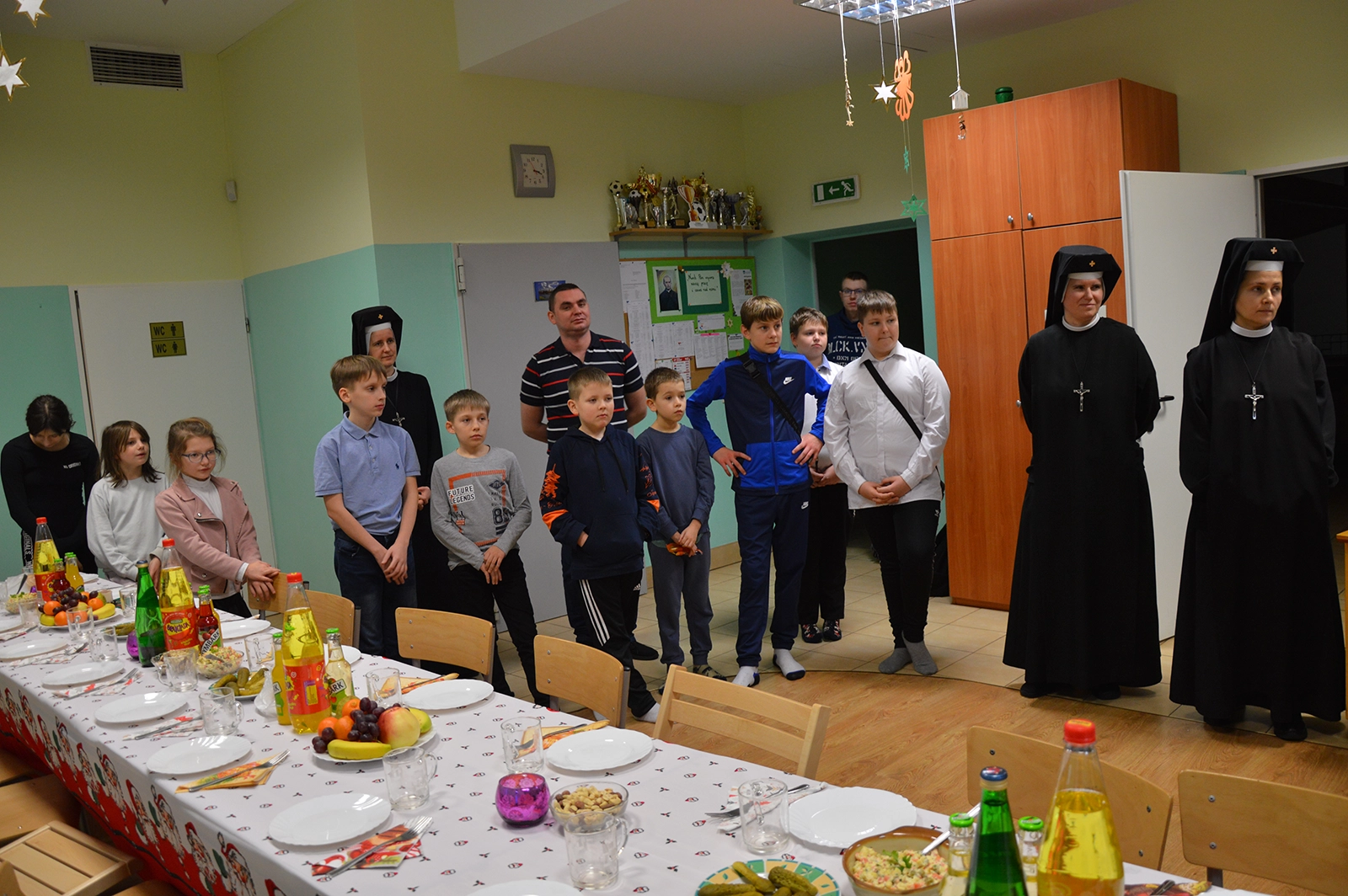 Następnie uroczysty posiłek i rozmowy przy stole, a w tle melodia kolęd. Odważni występowali, śpiewając do mikrofonu ulubione utwory. Świętowaniu nie było końca. Czuliśmy się jedną wielką wspólnotą serc. Na koniec oczywiście wyczekiwane prezenty od św. Mikołaja dla każdego wychowanka.