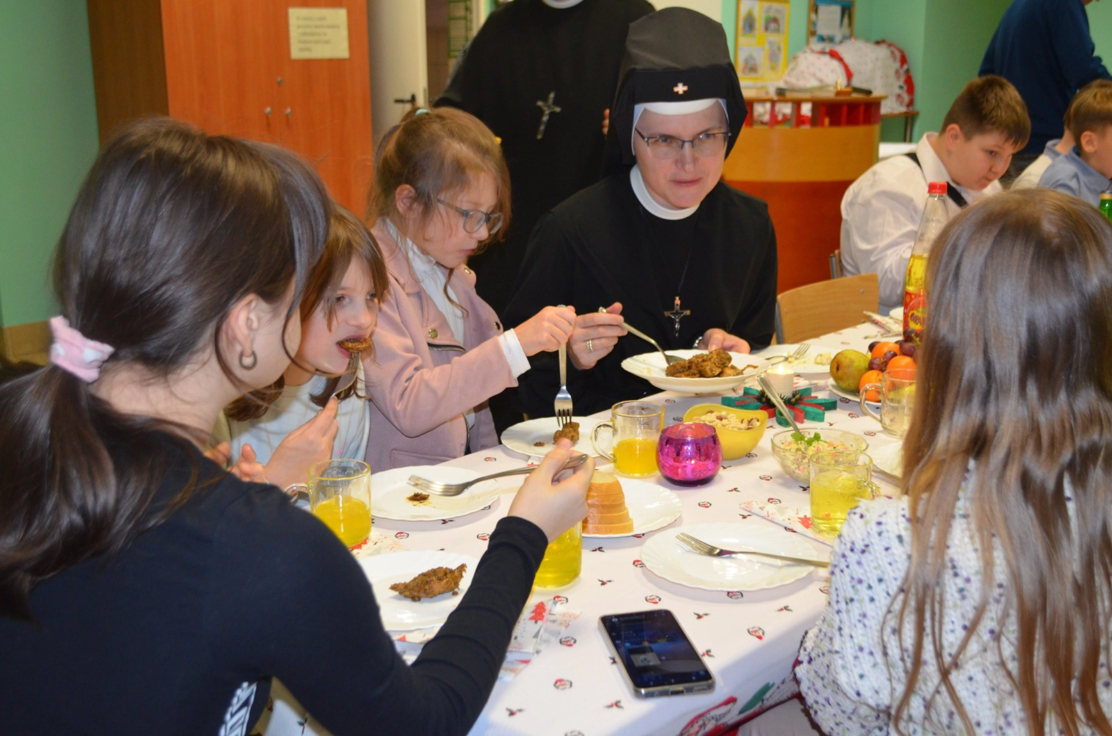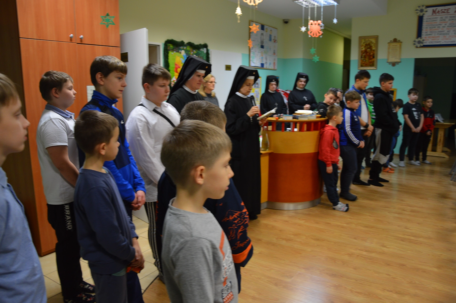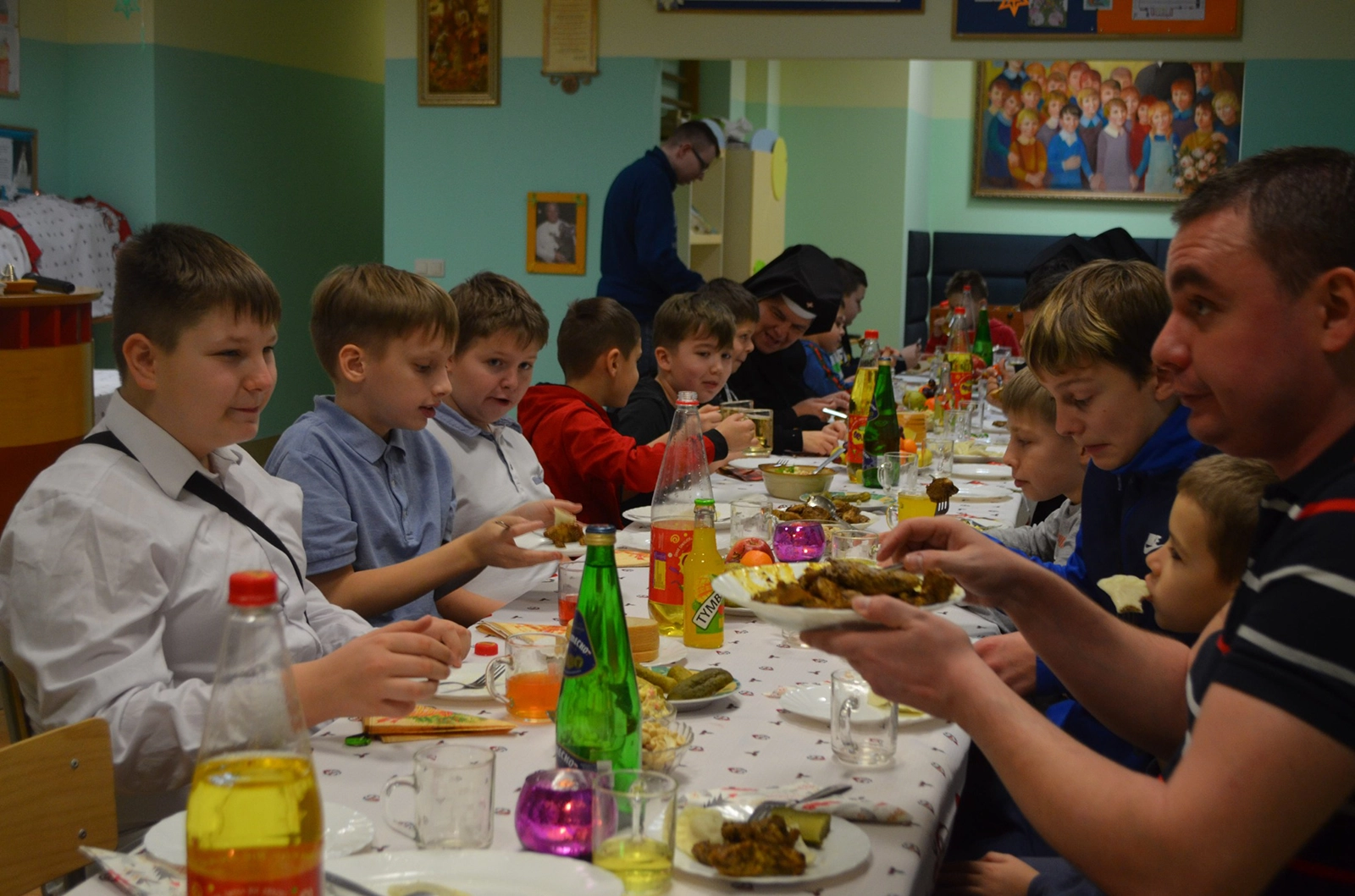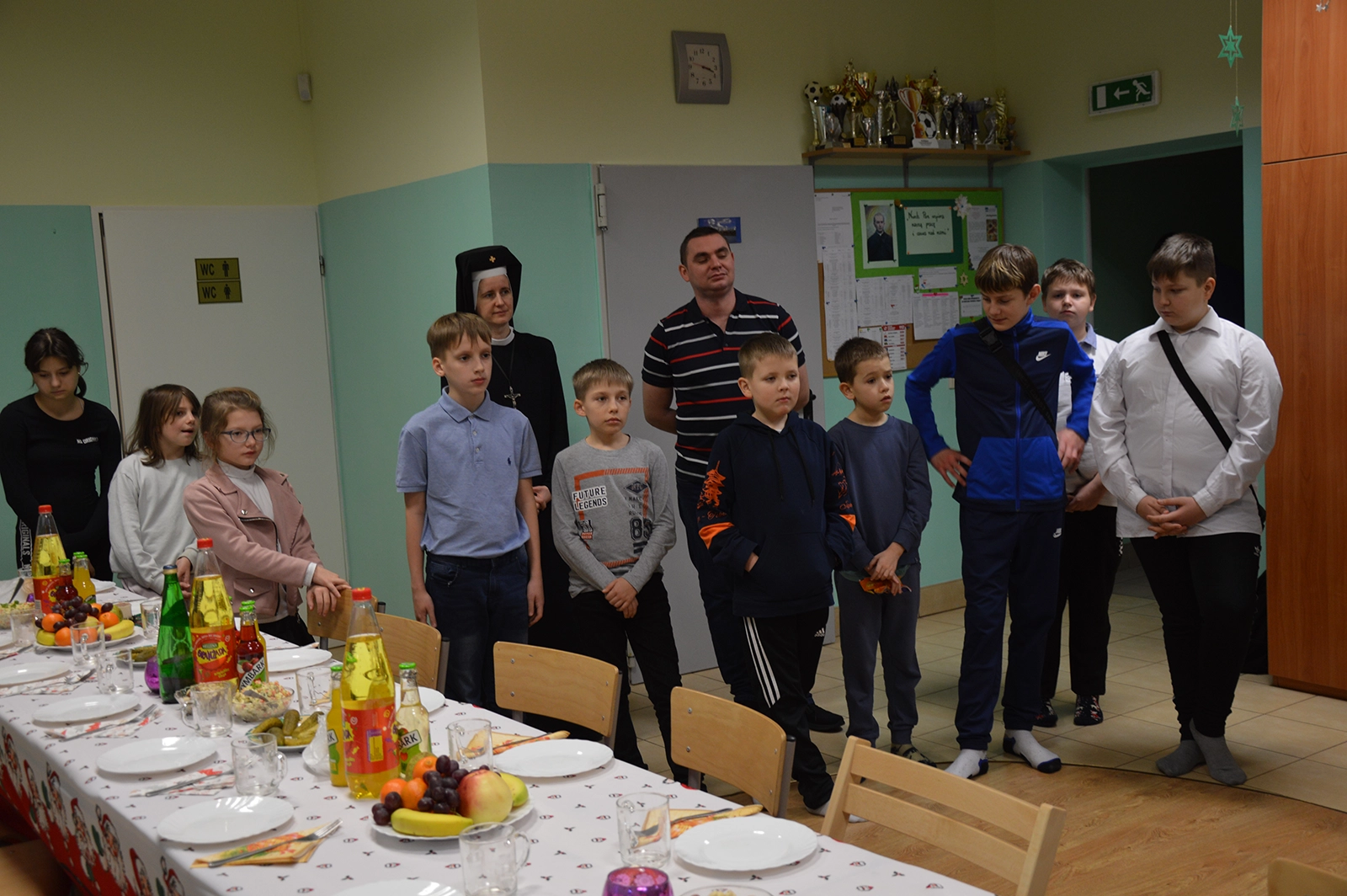 Następnie uroczysty posiłek i rozmowy przy stole, a w tle melodia kolęd. Odważni występowali, śpiewając do mikrofonu ulubione utwory. Świętowaniu nie było końca. Czuliśmy się jedną wielką wspólnotą serc. Na koniec oczywiście wyczekiwane prezenty od św. Mikołaja dla każdego wychowanka.