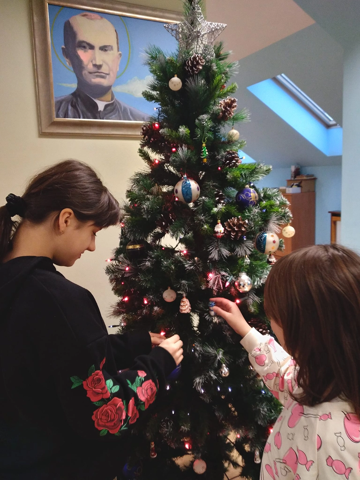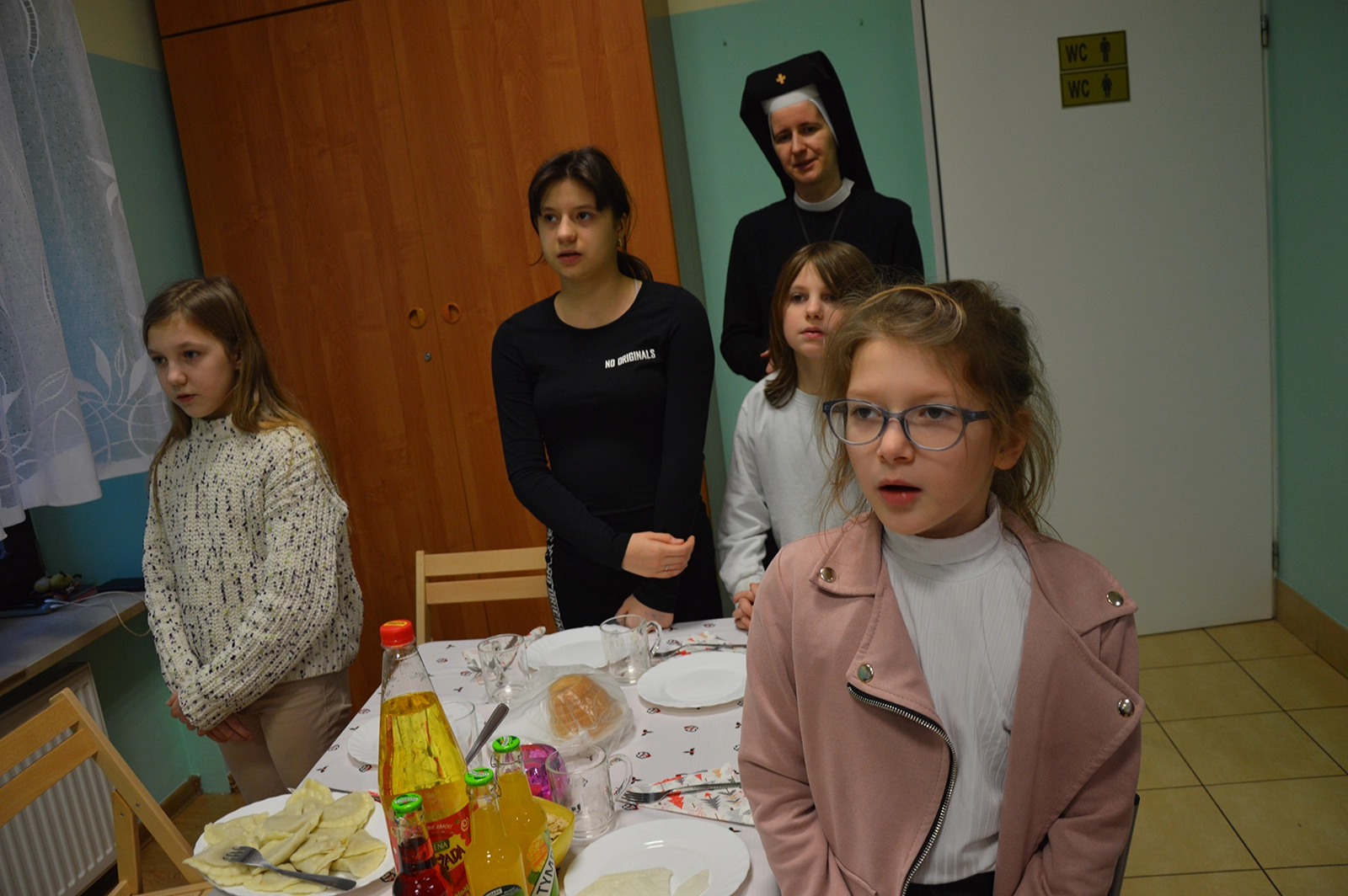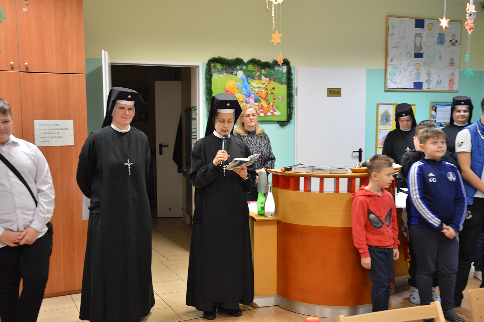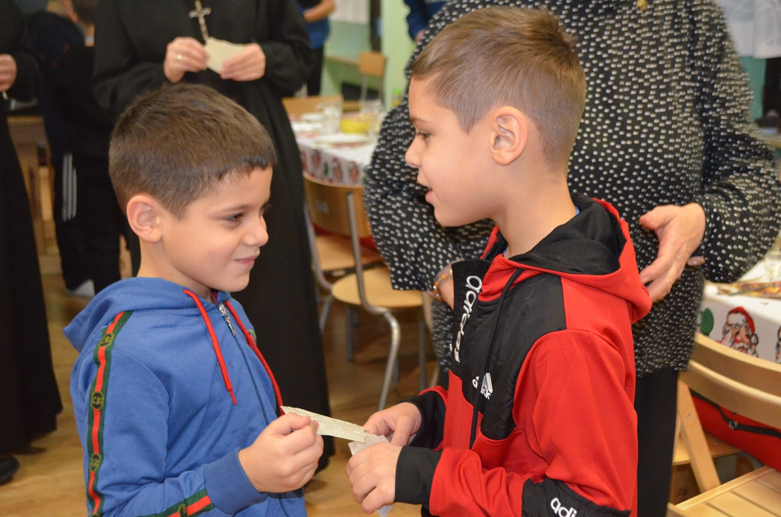 Następnie uroczysty posiłek i rozmowy przy stole, a w tle melodia kolęd. Odważni występowali, śpiewając do mikrofonu ulubione utwory. Świętowaniu nie było końca. Czuliśmy się jedną wielką wspólnotą serc. Na koniec oczywiście wyczekiwane prezenty od św. Mikołaja dla każdego wychowanka.