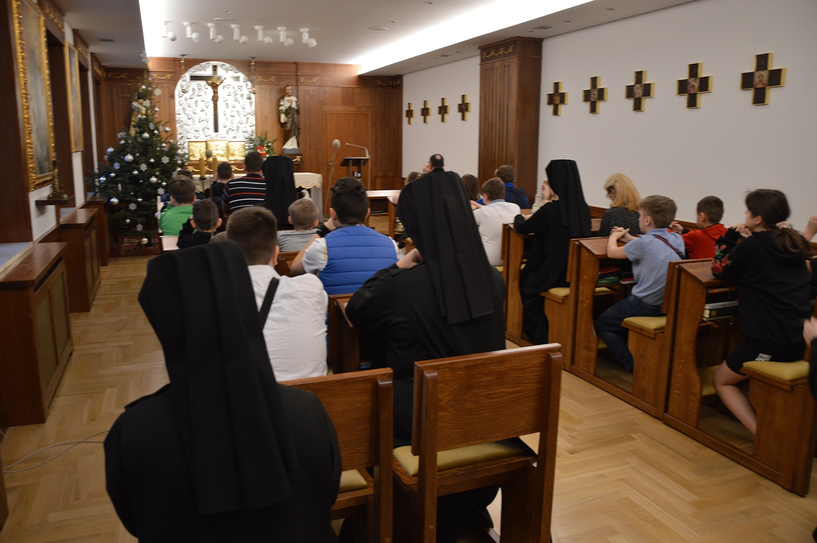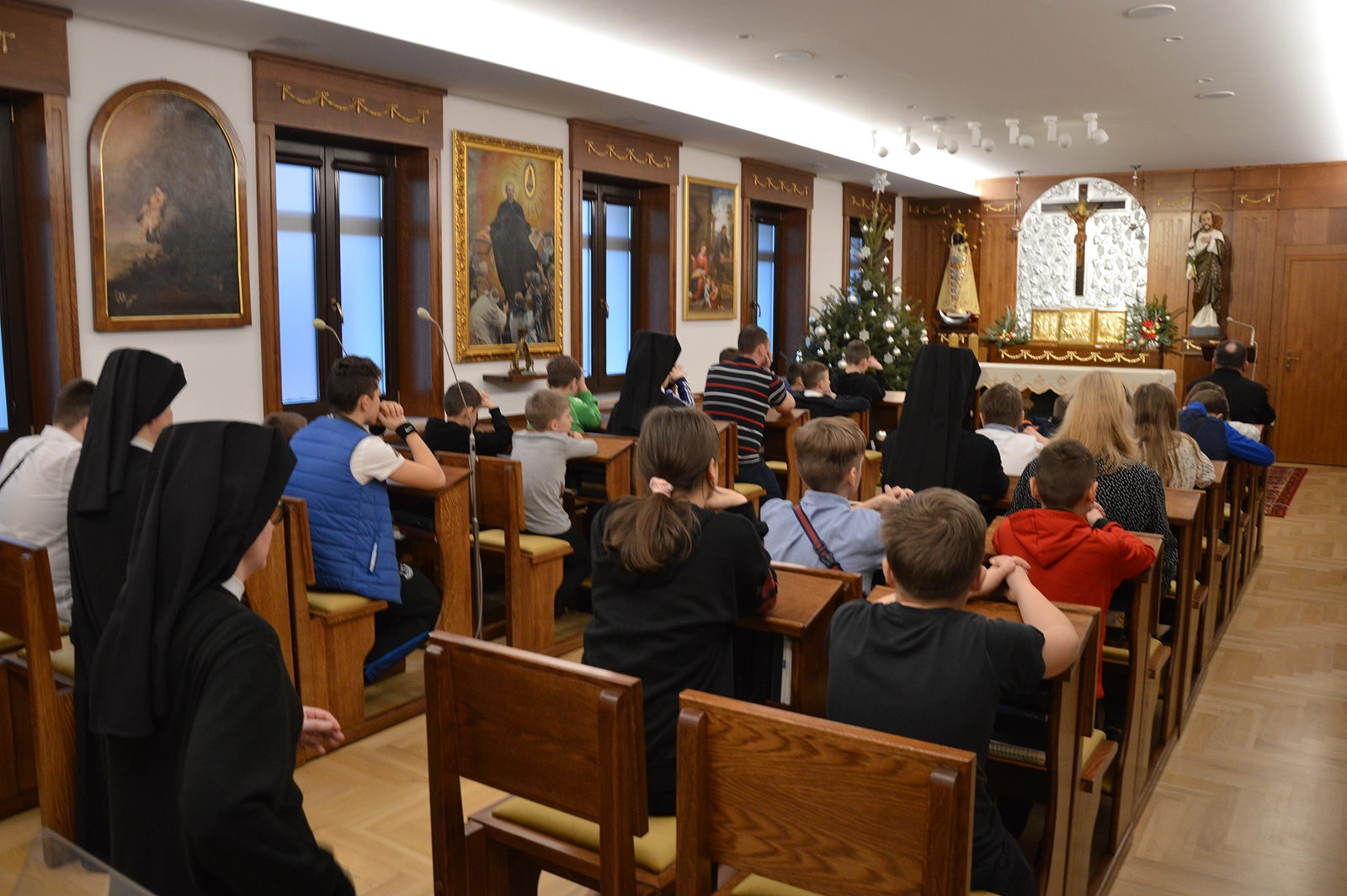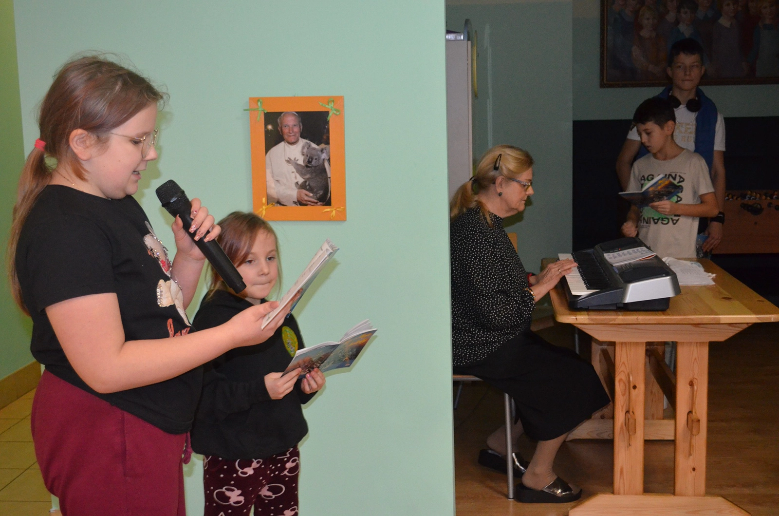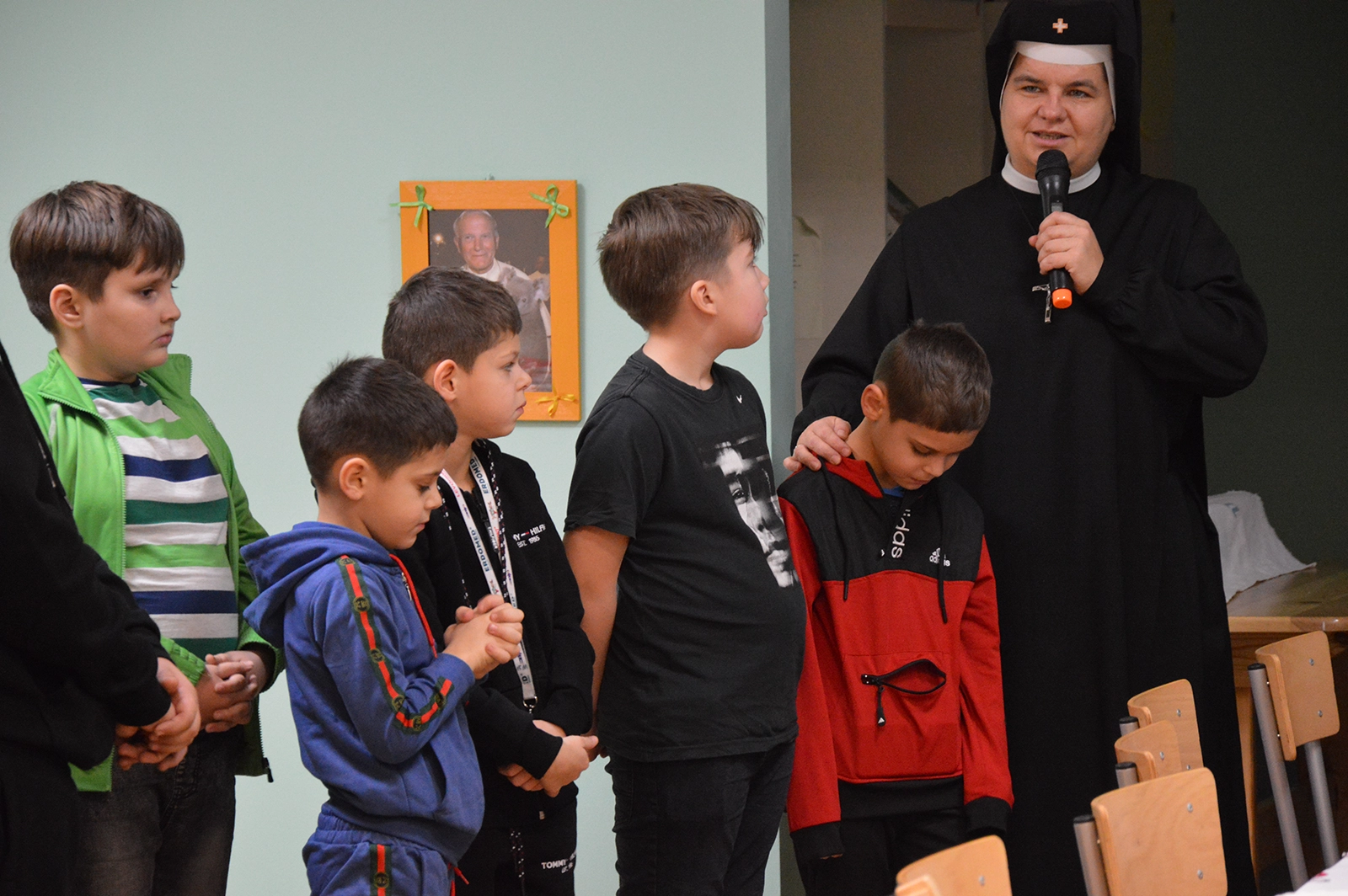 Następnie uroczysty posiłek i rozmowy przy stole, a w tle melodia kolęd. Odważni występowali, śpiewając do mikrofonu ulubione utwory. Świętowaniu nie było końca. Czuliśmy się jedną wielką wspólnotą serc. Na koniec oczywiście wyczekiwane prezenty od św. Mikołaja dla każdego wychowanka.