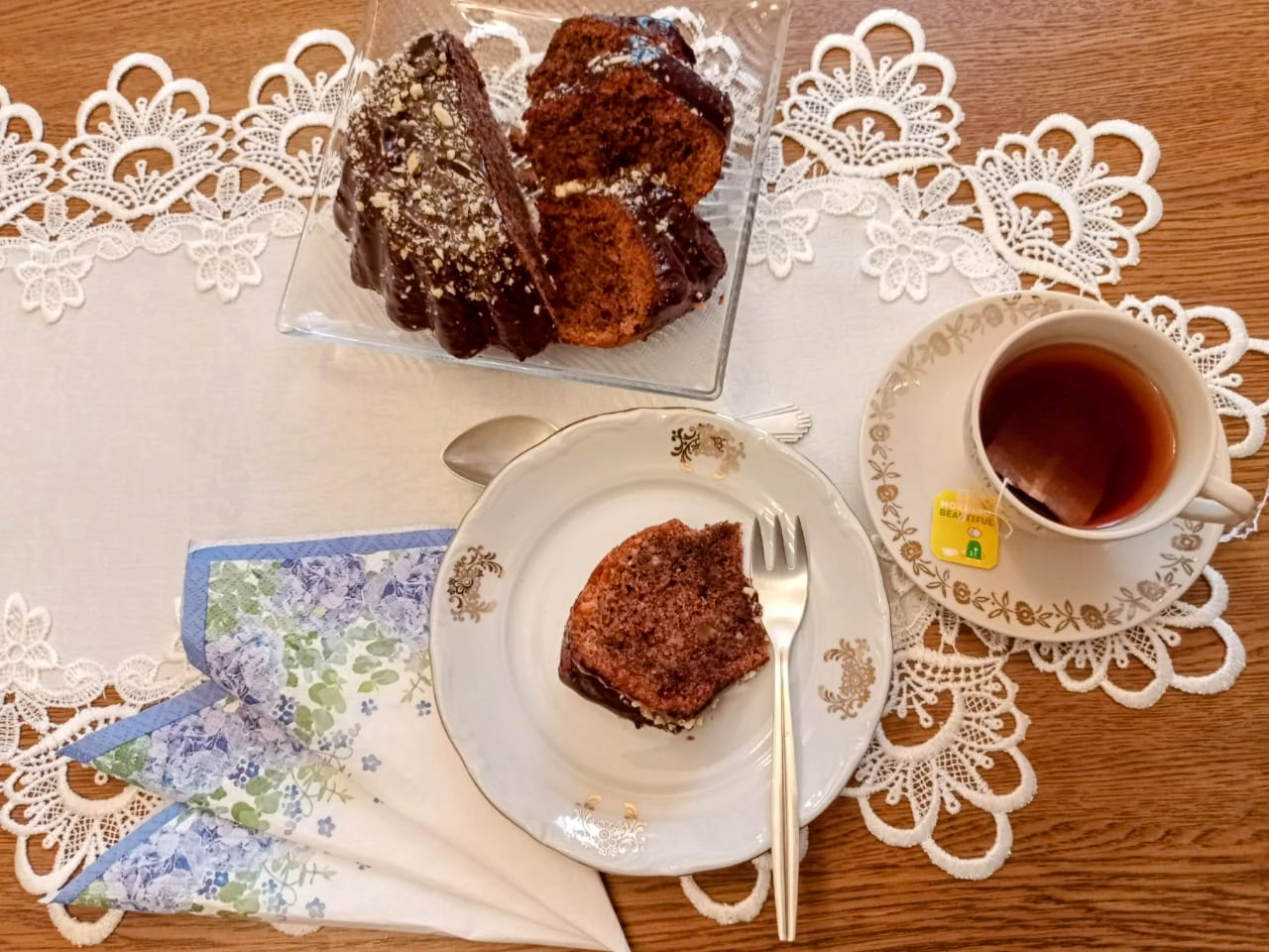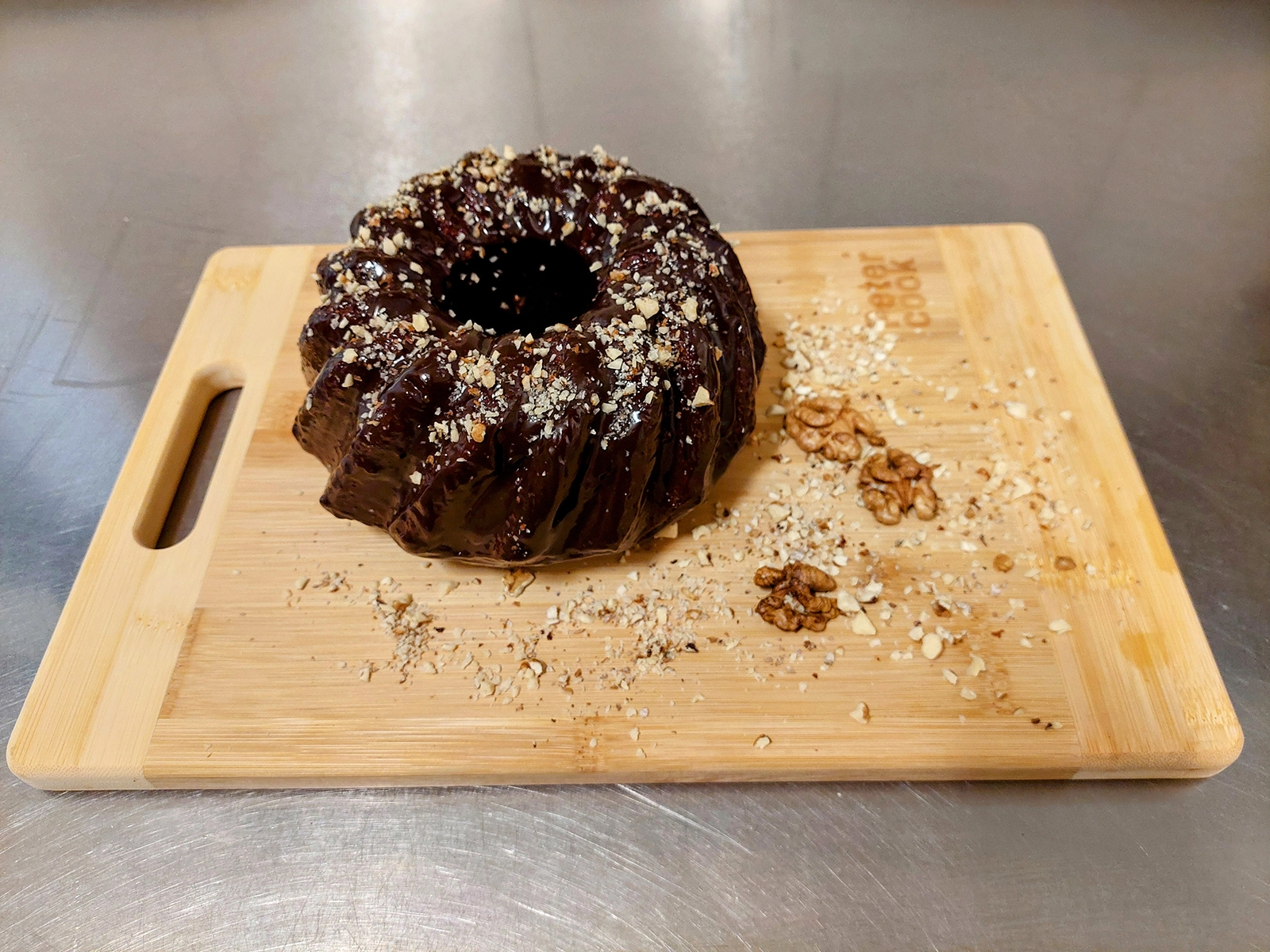Po wystygnięciu babkę możemy polać polewą czekoladową i posypać posiekanymi orzechami.
