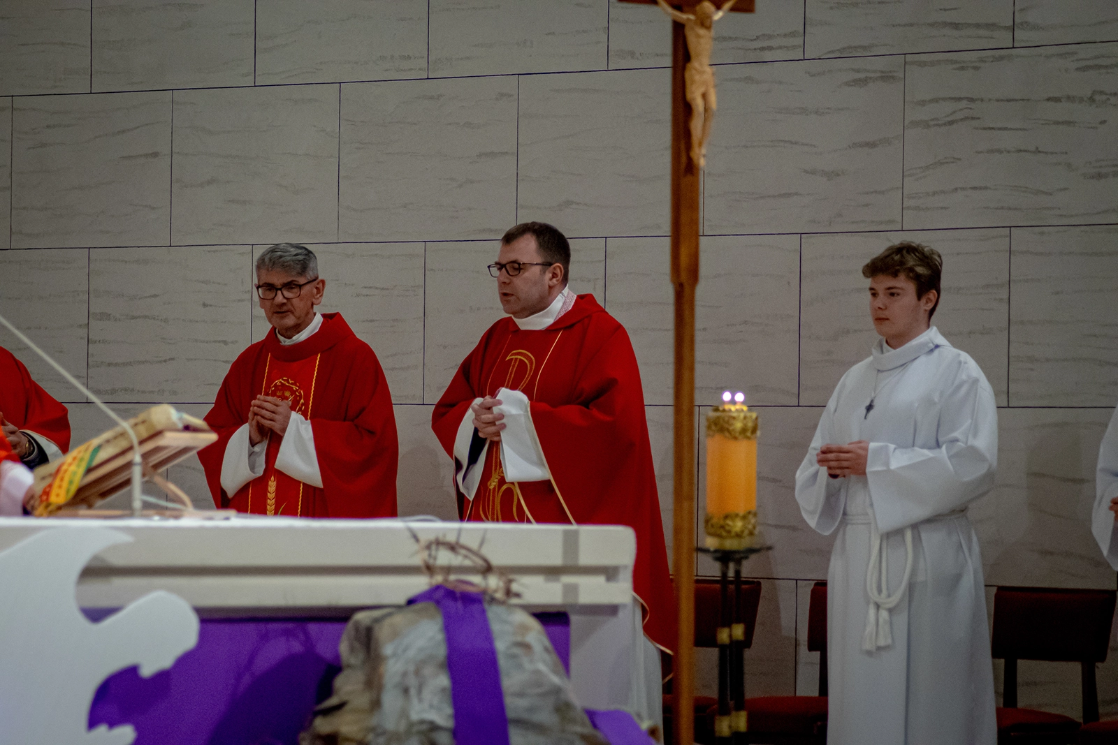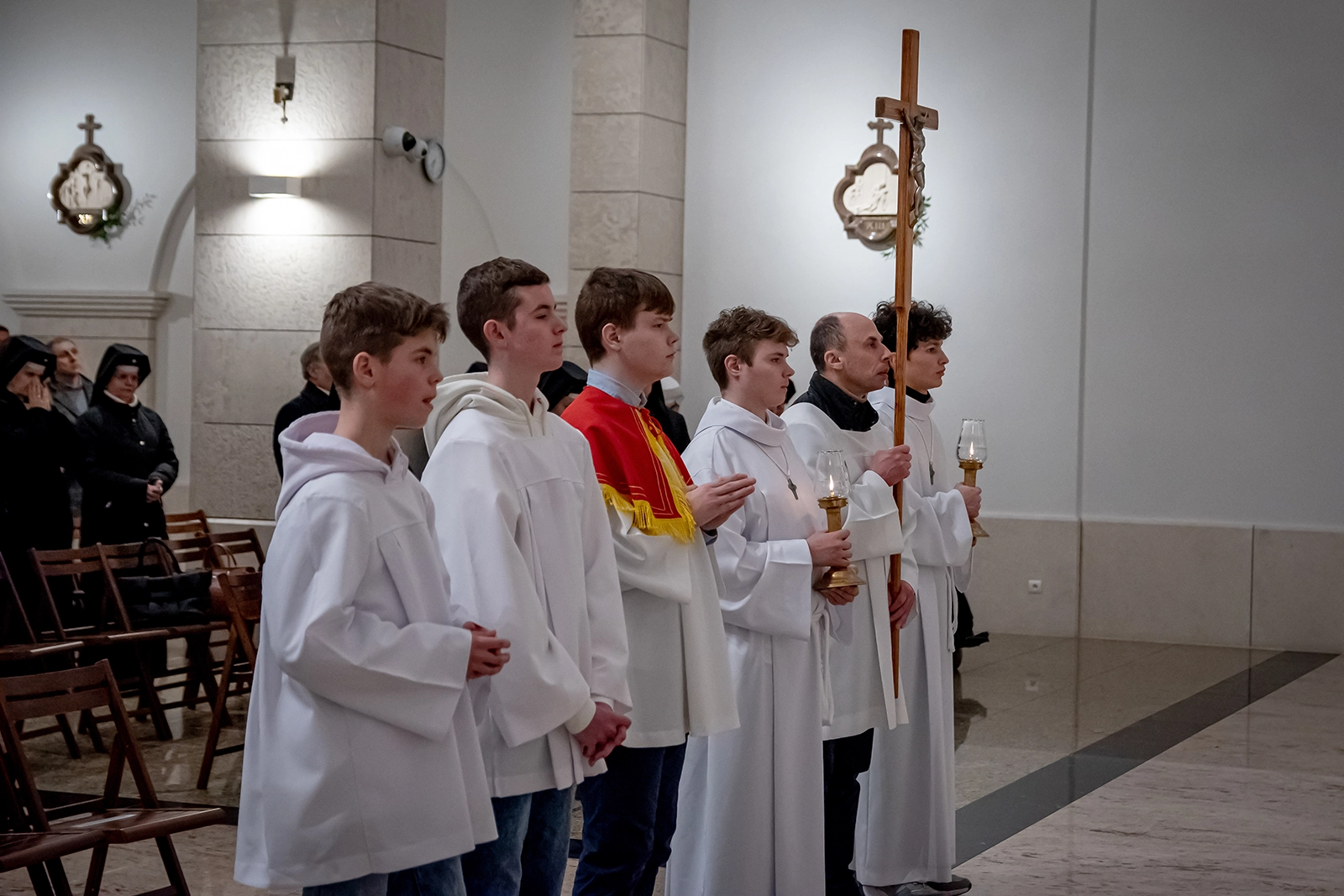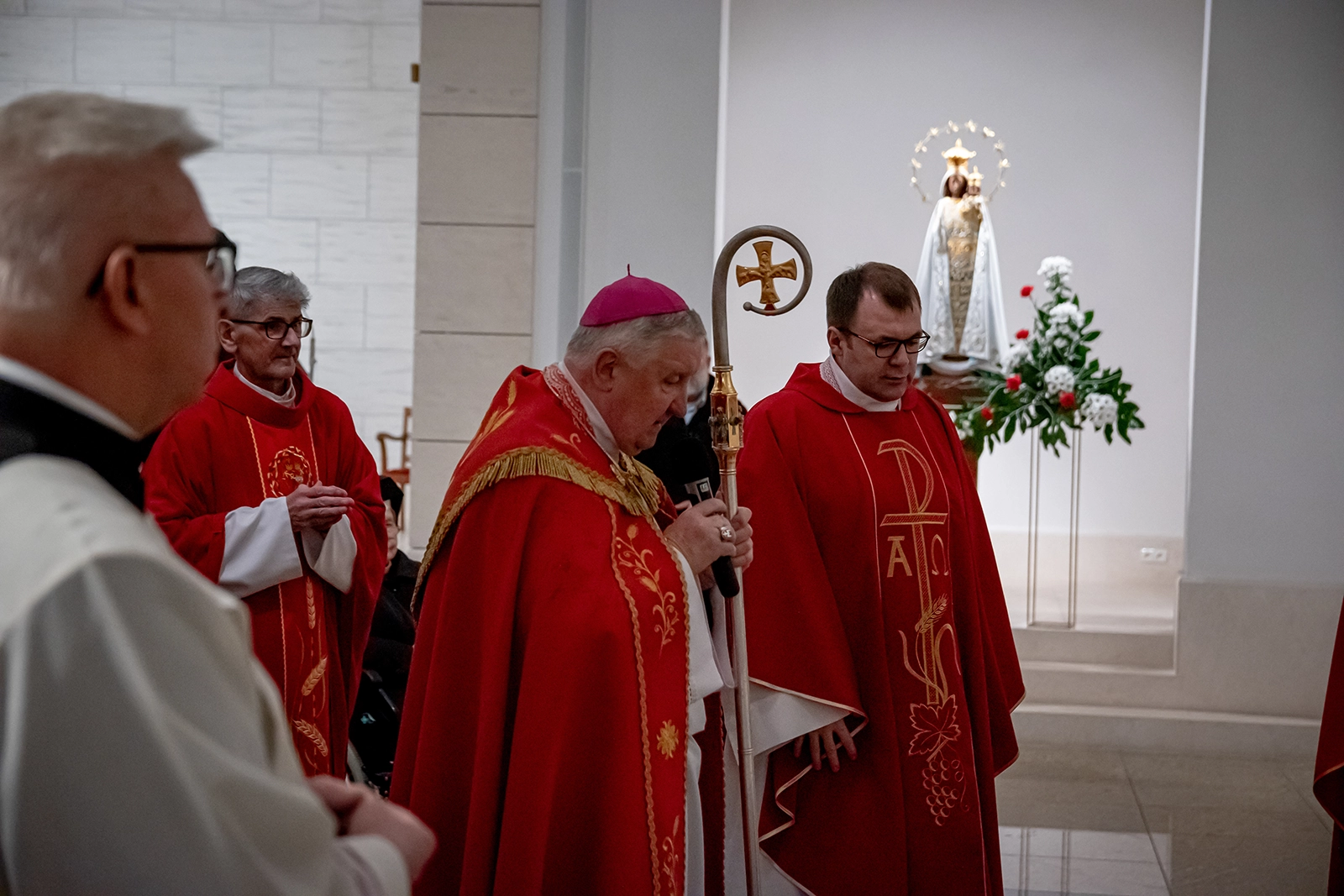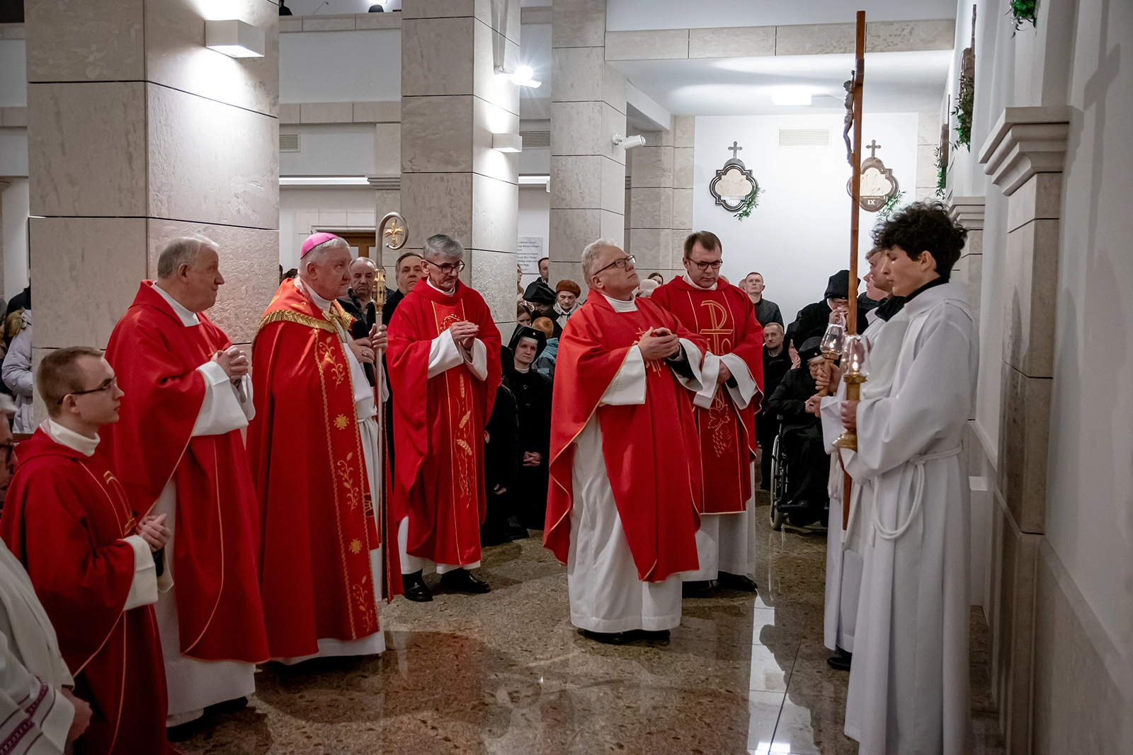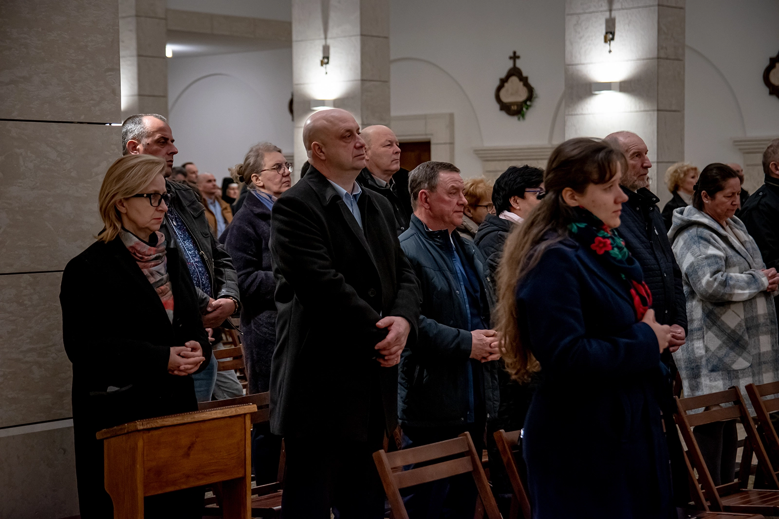 Uroczystość rozpoczęła się o godz. 18.00 Mszą Świętą, której przewodniczył ks. bp Romuald Kamiński w obecności siedmiu kapłanów. Pasterz w homilii podkreślał, aby w trakcie rozważań kolejnych stacji Drogi krzyżowej w poszczególnych jej wydarzeniach i postaciach odnajdywać siebie – „są [wśród nich] tacy, którzy nic nie zrozumieli, i są tacy, którzy wychodzą zwycięsko. Do tych pierwszych, którzy nic nie zrozumieli, zapewne należą ci, którzy skazali Pana Jezusa na śmierć, włożyli na Jego barki krzyż i kazali dźwigać na miejsce ukrzyżowania. Ale jako pierwsza osoba, jakby z innego świata, zjawia się Najwierniejszy Uczeń Boży – Matka Najświętsza, która dużo wcześniej zrozumiała wielkie sprawy Boże”.