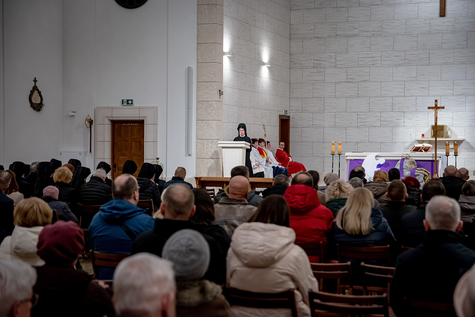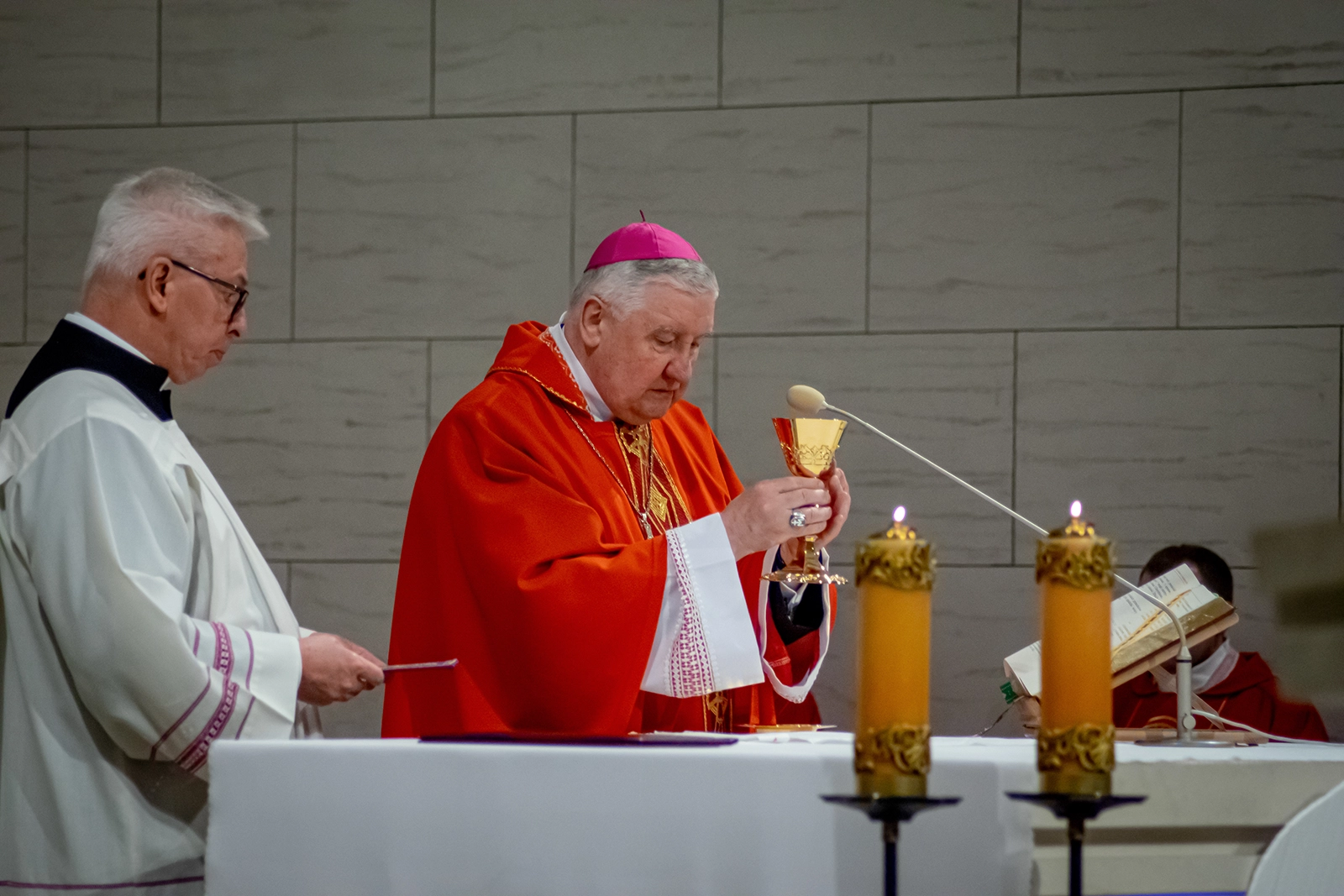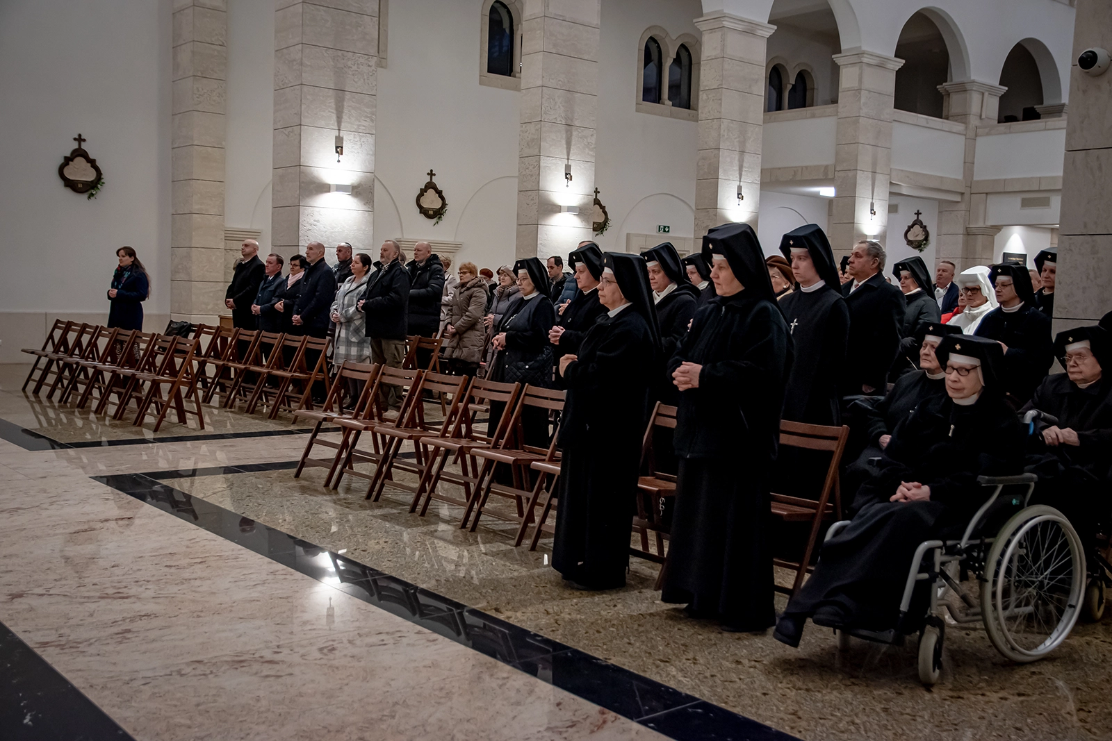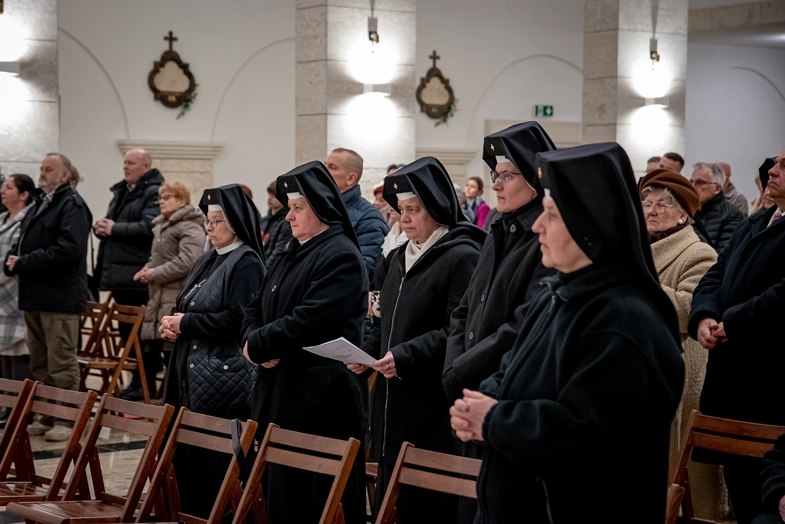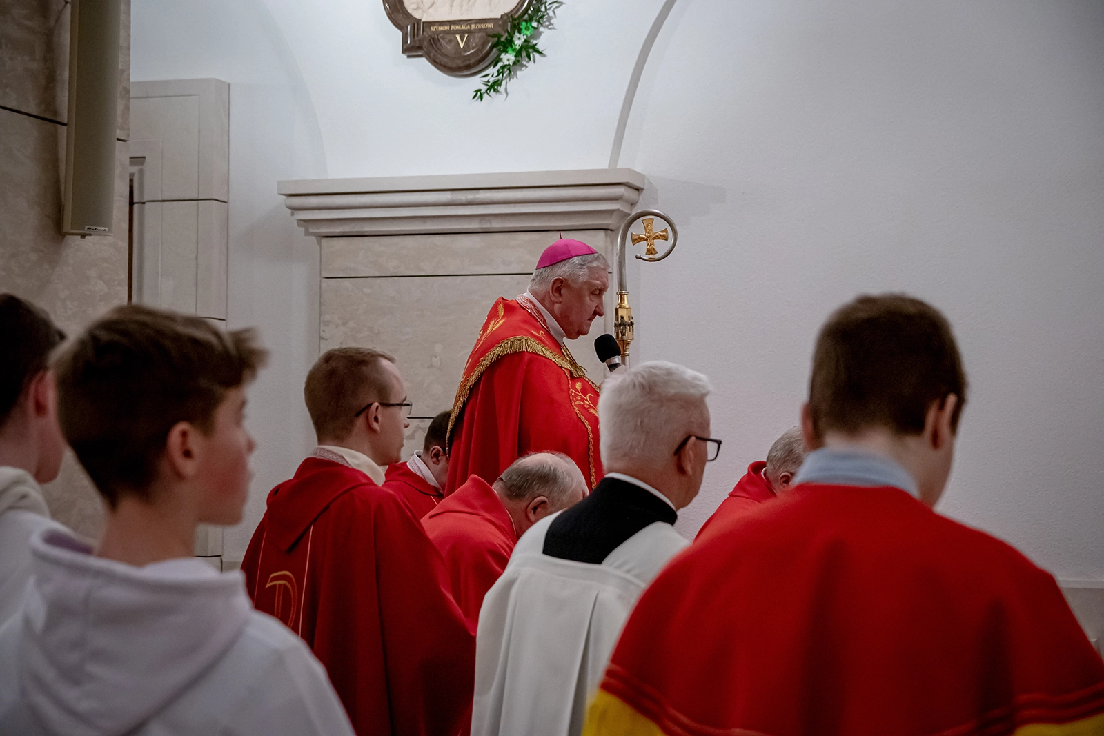 Uroczystość rozpoczęła się o godz. 18.00 Mszą Świętą, której przewodniczył ks. bp Romuald Kamiński w obecności siedmiu kapłanów. Pasterz w homilii podkreślał, aby w trakcie rozważań kolejnych stacji Drogi krzyżowej w poszczególnych jej wydarzeniach i postaciach odnajdywać siebie – „są [wśród nich] tacy, którzy nic nie zrozumieli, i są tacy, którzy wychodzą zwycięsko. Do tych pierwszych, którzy nic nie zrozumieli, zapewne należą ci, którzy skazali Pana Jezusa na śmierć, włożyli na Jego barki krzyż i kazali dźwigać na miejsce ukrzyżowania. Ale jako pierwsza osoba, jakby z innego świata, zjawia się Najwierniejszy Uczeń Boży – Matka Najświętsza, która dużo wcześniej zrozumiała wielkie sprawy Boże”.