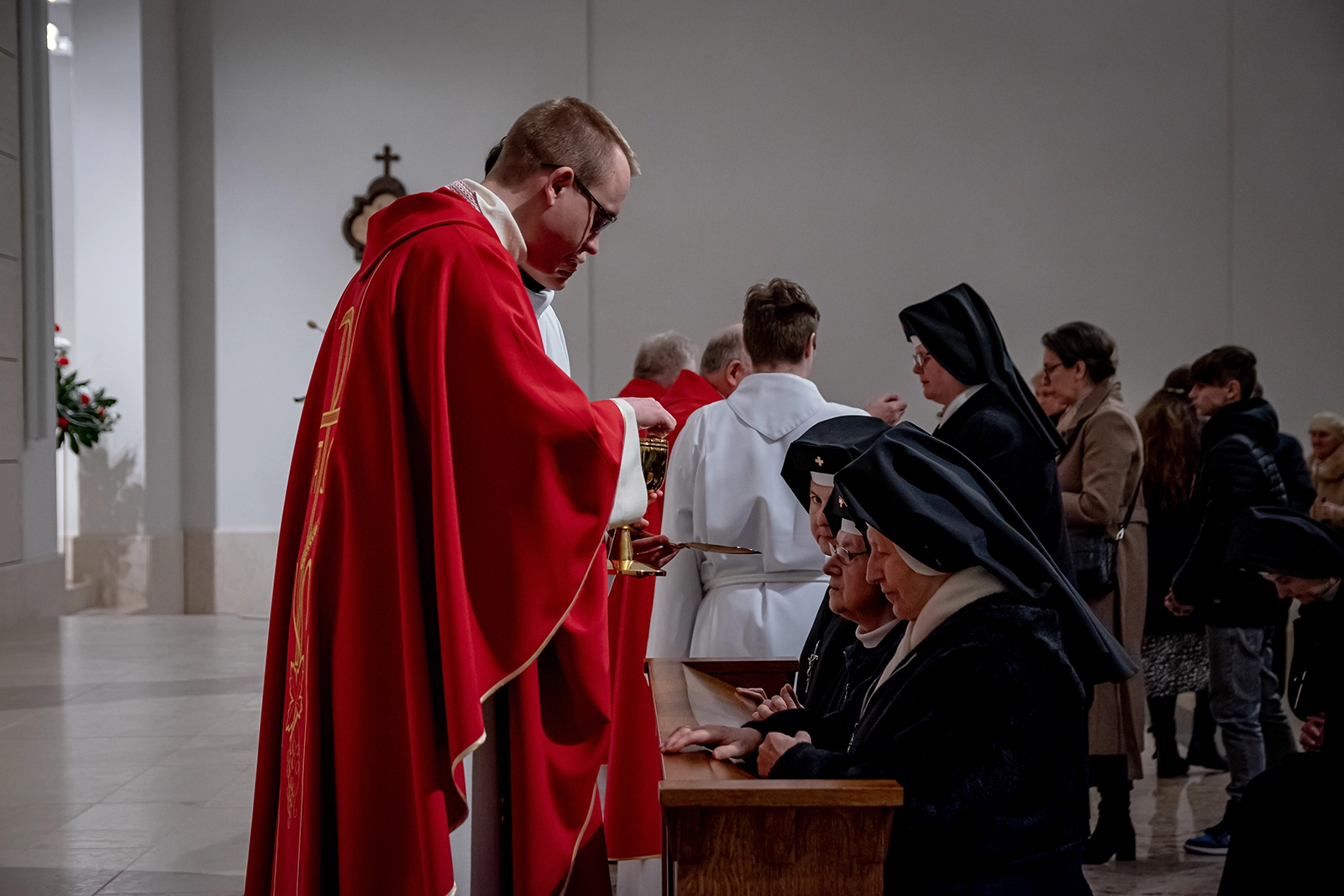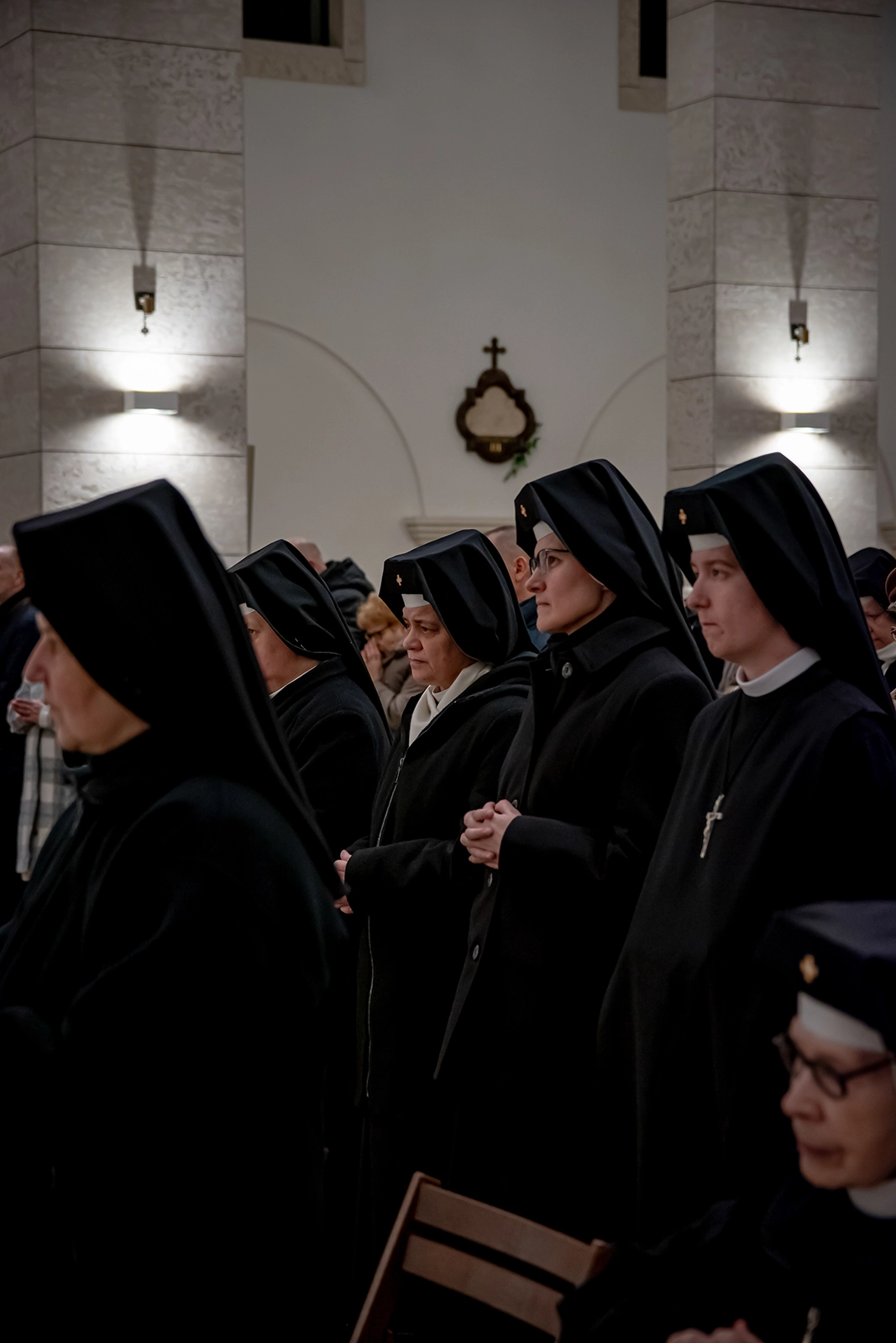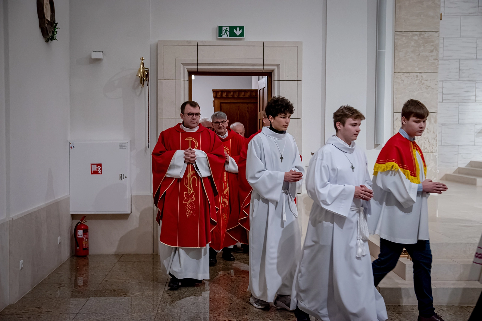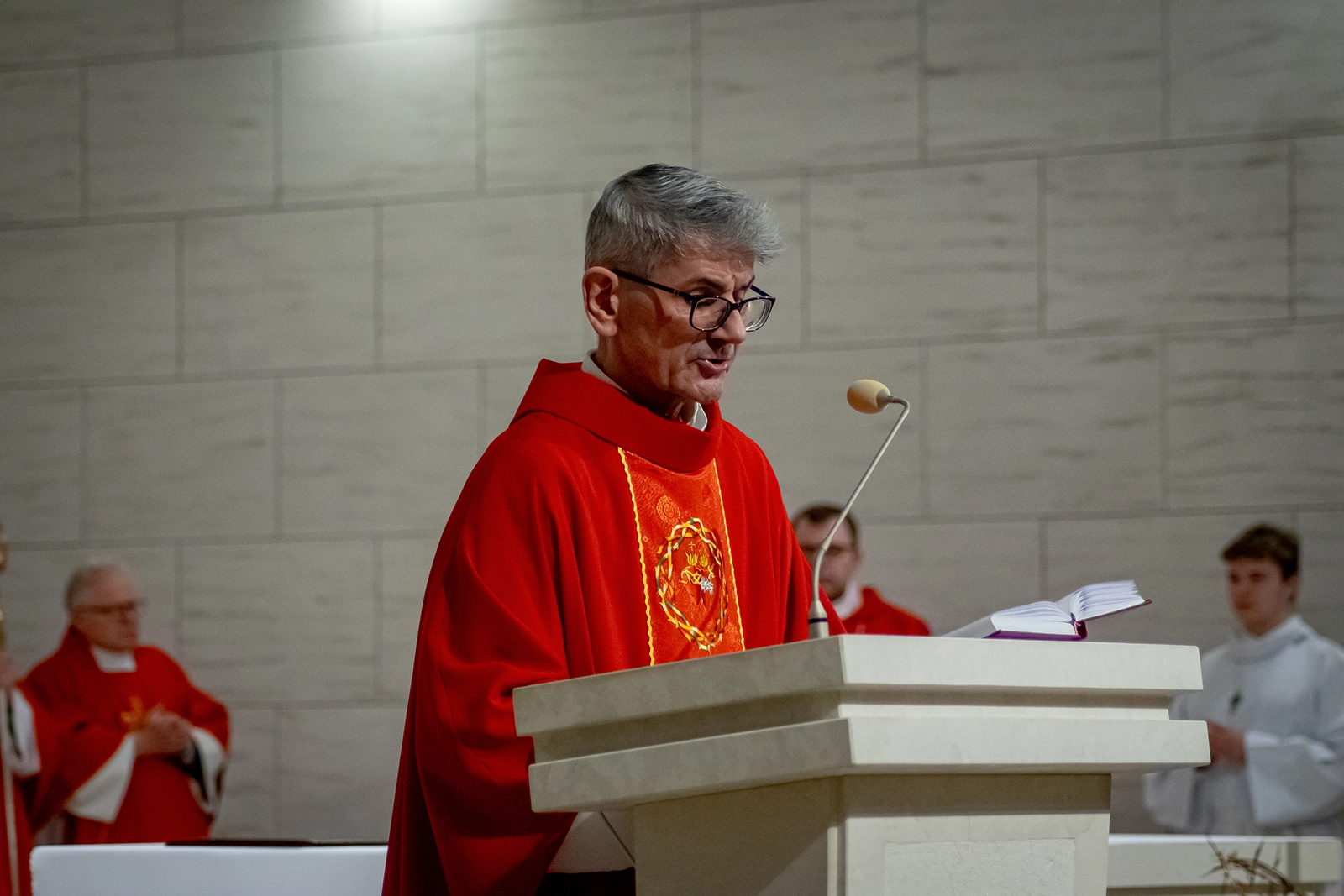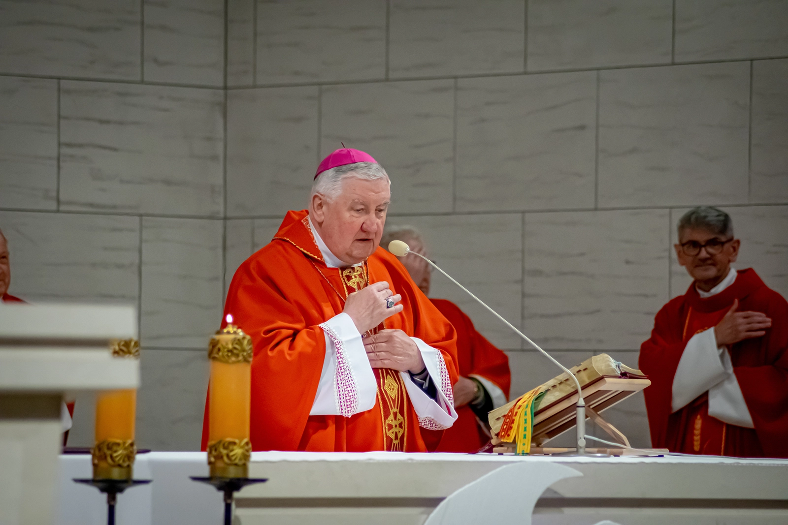 Uroczystość rozpoczęła się o godz. 18.00 Mszą Świętą, której przewodniczył ks. bp Romuald Kamiński w obecności siedmiu kapłanów. Pasterz w homilii podkreślał, aby w trakcie rozważań kolejnych stacji Drogi krzyżowej w poszczególnych jej wydarzeniach i postaciach odnajdywać siebie – „są [wśród nich] tacy, którzy nic nie zrozumieli, i są tacy, którzy wychodzą zwycięsko. Do tych pierwszych, którzy nic nie zrozumieli, zapewne należą ci, którzy skazali Pana Jezusa na śmierć, włożyli na Jego barki krzyż i kazali dźwigać na miejsce ukrzyżowania. Ale jako pierwsza osoba, jakby z innego świata, zjawia się Najwierniejszy Uczeń Boży – Matka Najświętsza, która dużo wcześniej zrozumiała wielkie sprawy Boże”.