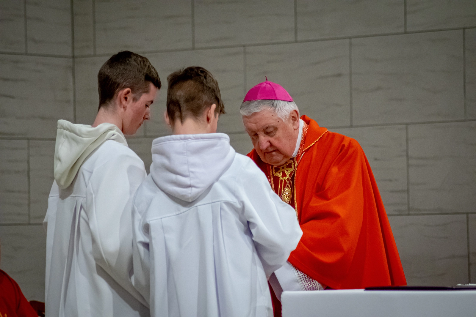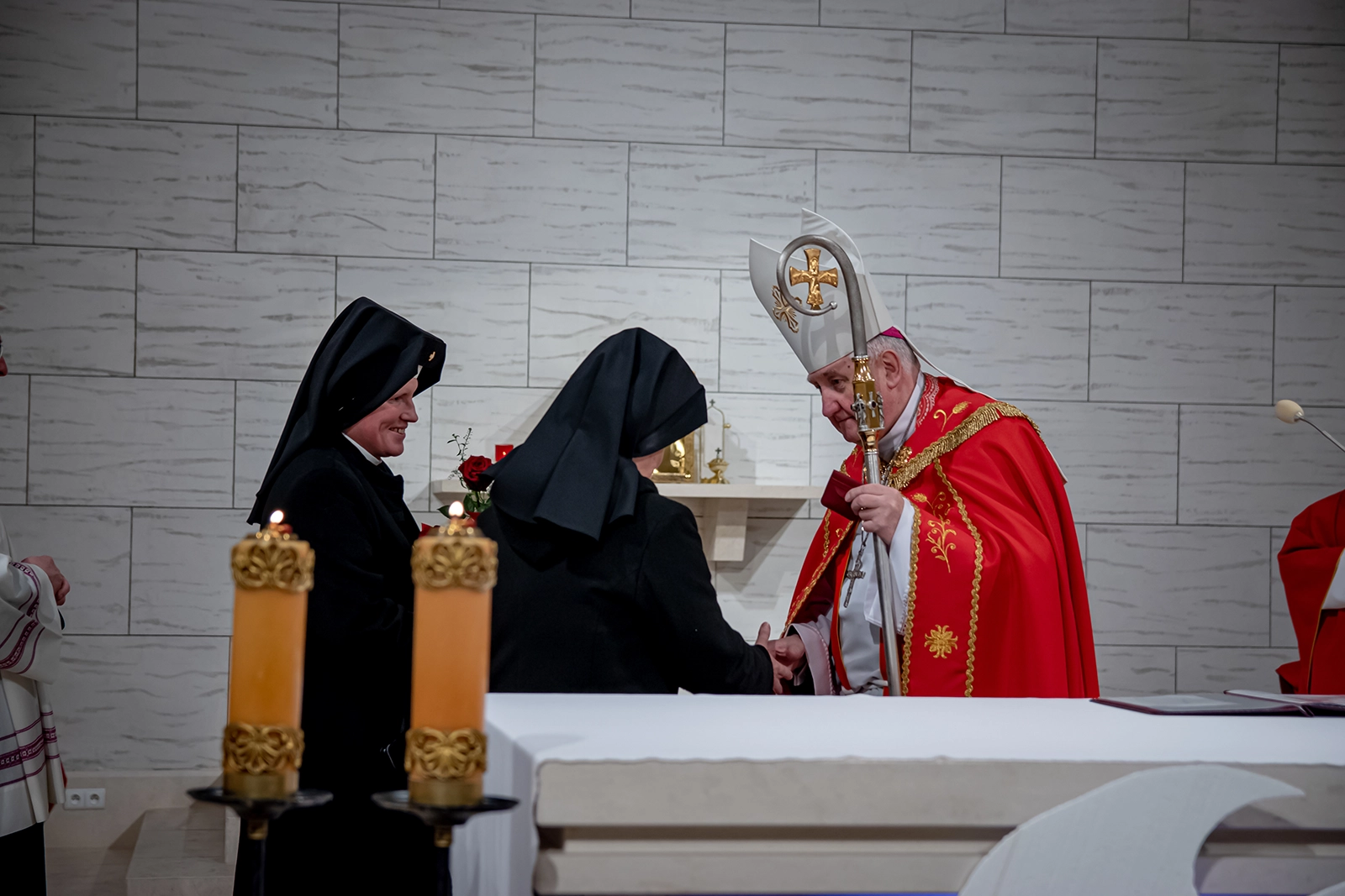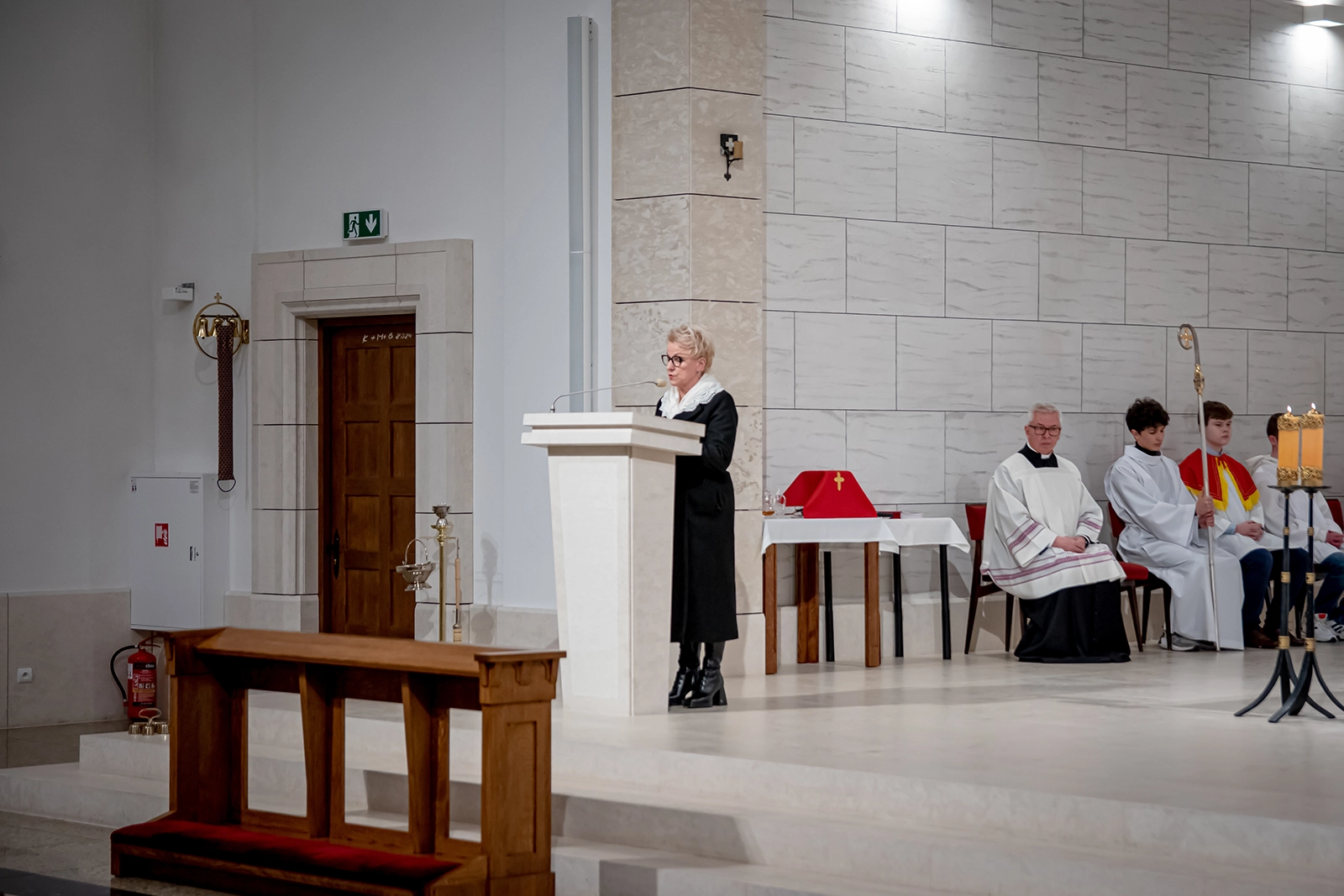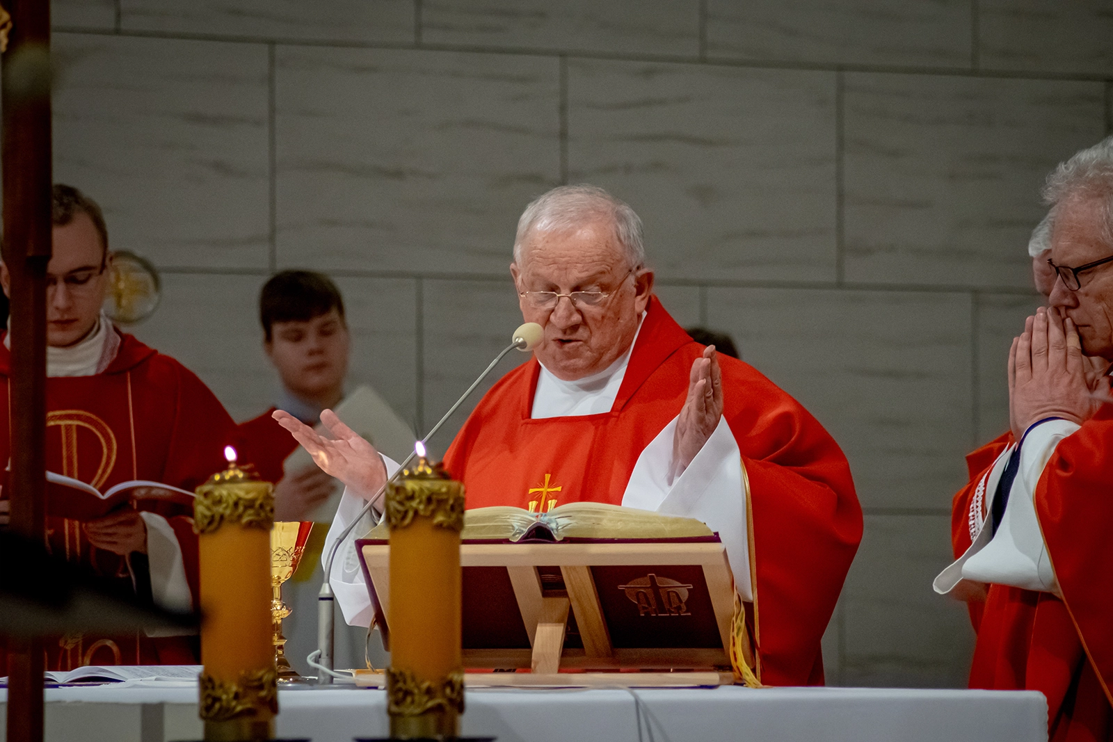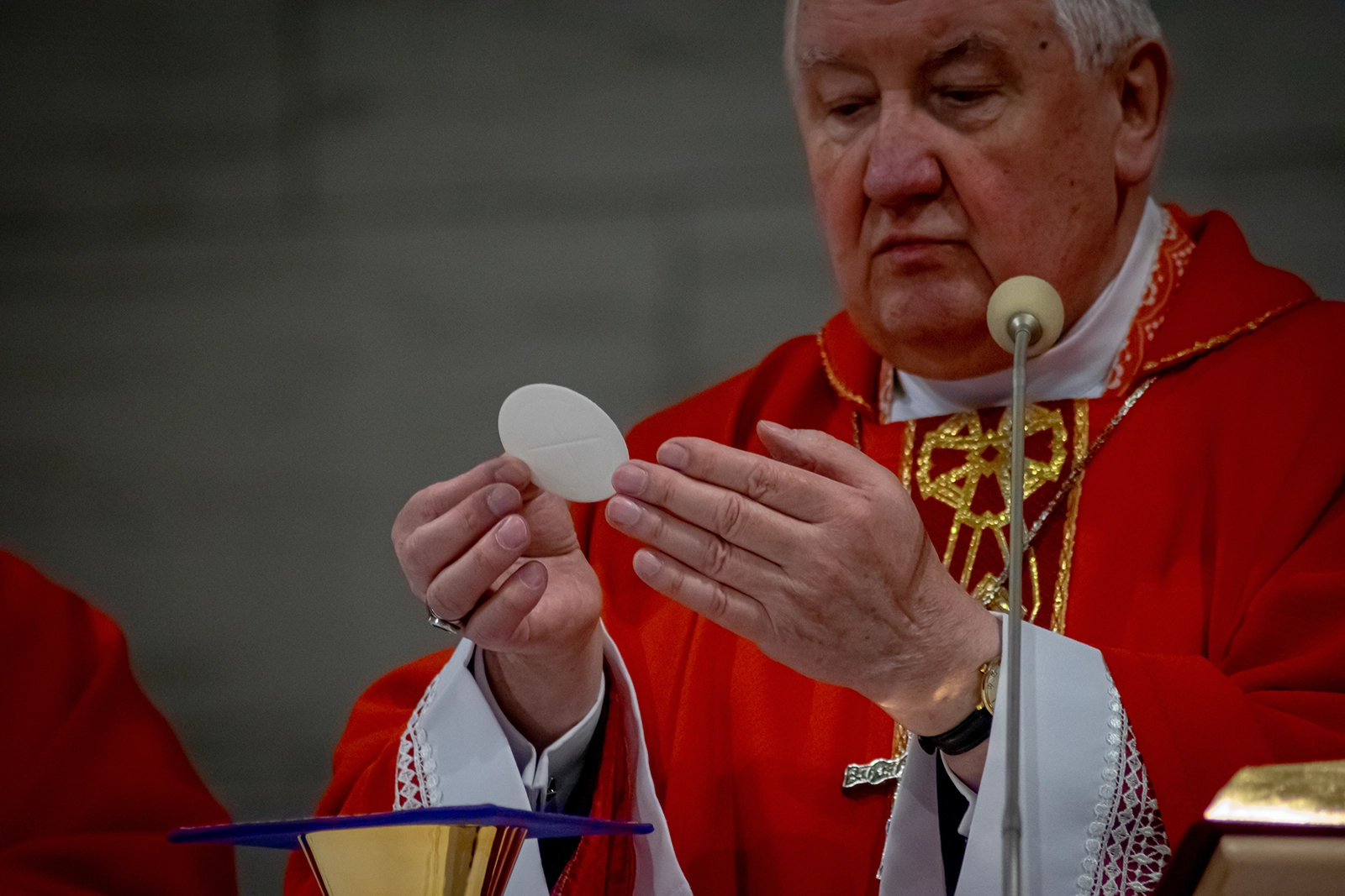 Uroczystość rozpoczęła się o godz. 18.00 Mszą Świętą, której przewodniczył ks. bp Romuald Kamiński w obecności siedmiu kapłanów. Pasterz w homilii podkreślał, aby w trakcie rozważań kolejnych stacji Drogi krzyżowej w poszczególnych jej wydarzeniach i postaciach odnajdywać siebie – „są [wśród nich] tacy, którzy nic nie zrozumieli, i są tacy, którzy wychodzą zwycięsko. Do tych pierwszych, którzy nic nie zrozumieli, zapewne należą ci, którzy skazali Pana Jezusa na śmierć, włożyli na Jego barki krzyż i kazali dźwigać na miejsce ukrzyżowania. Ale jako pierwsza osoba, jakby z innego świata, zjawia się Najwierniejszy Uczeń Boży – Matka Najświętsza, która dużo wcześniej zrozumiała wielkie sprawy Boże”.