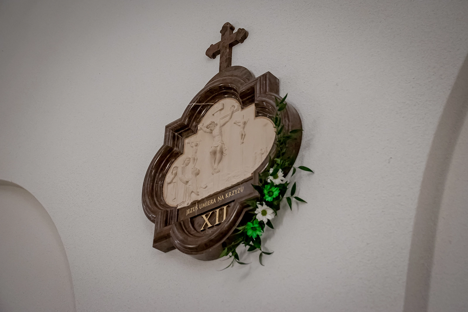 Czternaście stacji Drogi krzyżowej, które zostały poświęcone 15 marca przez ks. bp. Romualda Kamińskiego, wykonał artysta rzeźbiarz Paweł Pietrusiński. Wykonywanie płaskorzeźby w kamieniu to niełatwa praca, wymagająca skupienia, precyzji, bardzo dobrego warsztatu, a przede wszystkim zaangażowania serca, zwłaszcza gdy tworzone dzieło przedstawia wyraz nieskończonej, niepojętej miłości Boga do człowieka – Drogę krzyżową, przed którą można tylko uklęknąć w milczeniu, by Ją adorować i uwielbiać.
