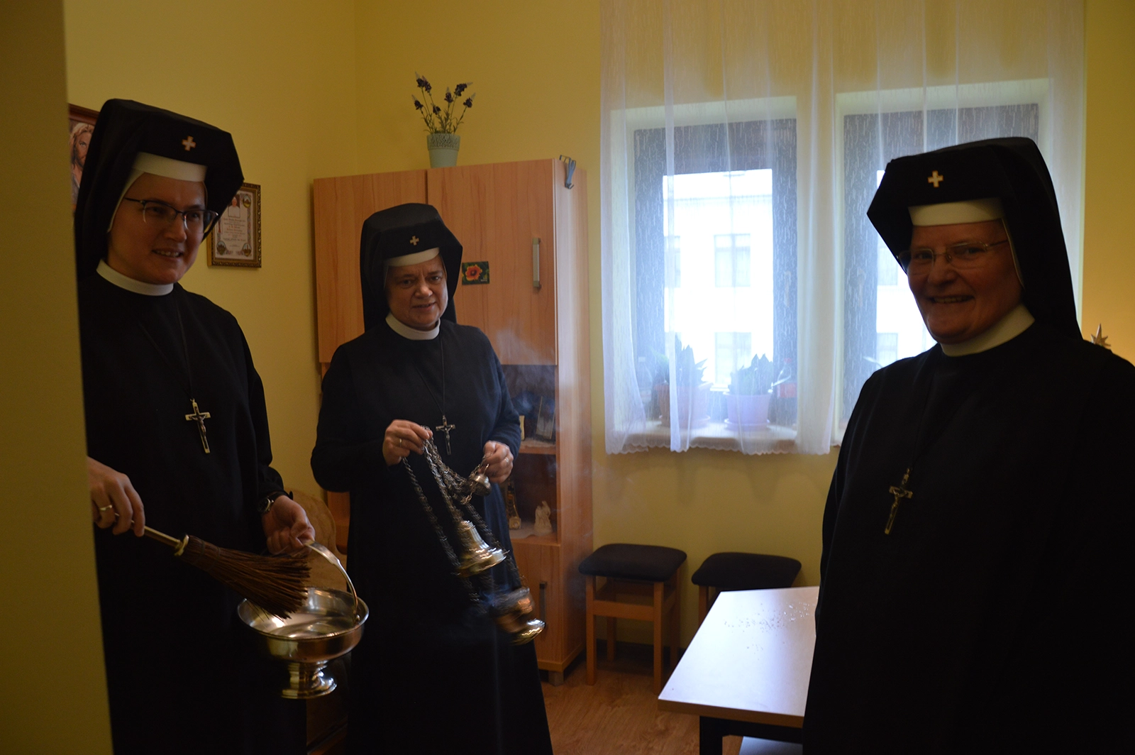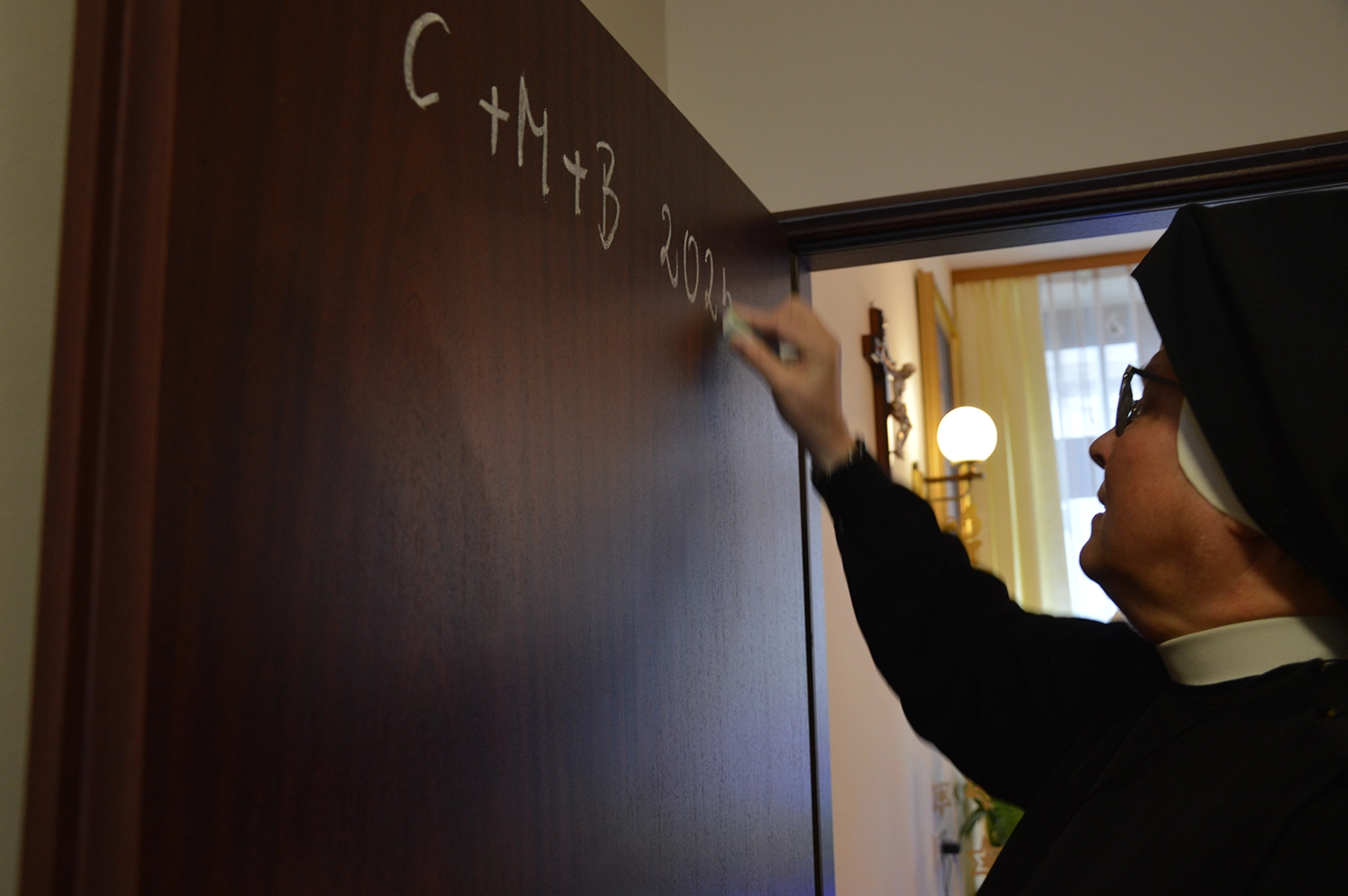 Wszystko rozpoczyna się w kaplicy, najważniejszym miejscu, gromadzą się wszystkie starsze i młodsze siostry, które tylko mogą wziąć udział w „pochodzie”, rozpoczynamy modlitwą. Unosi się dym kadzidła z trybularza dla Boga jak modlitwa (od IV wieku podczas liturgii używa się kadzidła, by przypominało o rzeczywistej obecności pośród nas Niewidzialnego, ale Obecnego Boga), jest pokropienie wodą święconą i pisanie na drzwiach C+M+B 2025, aby Boże Błogosławieństwo spoczęło na naszym domu, na tych, którzy będą tu przybywać i na nas, które tu mieszkamy.