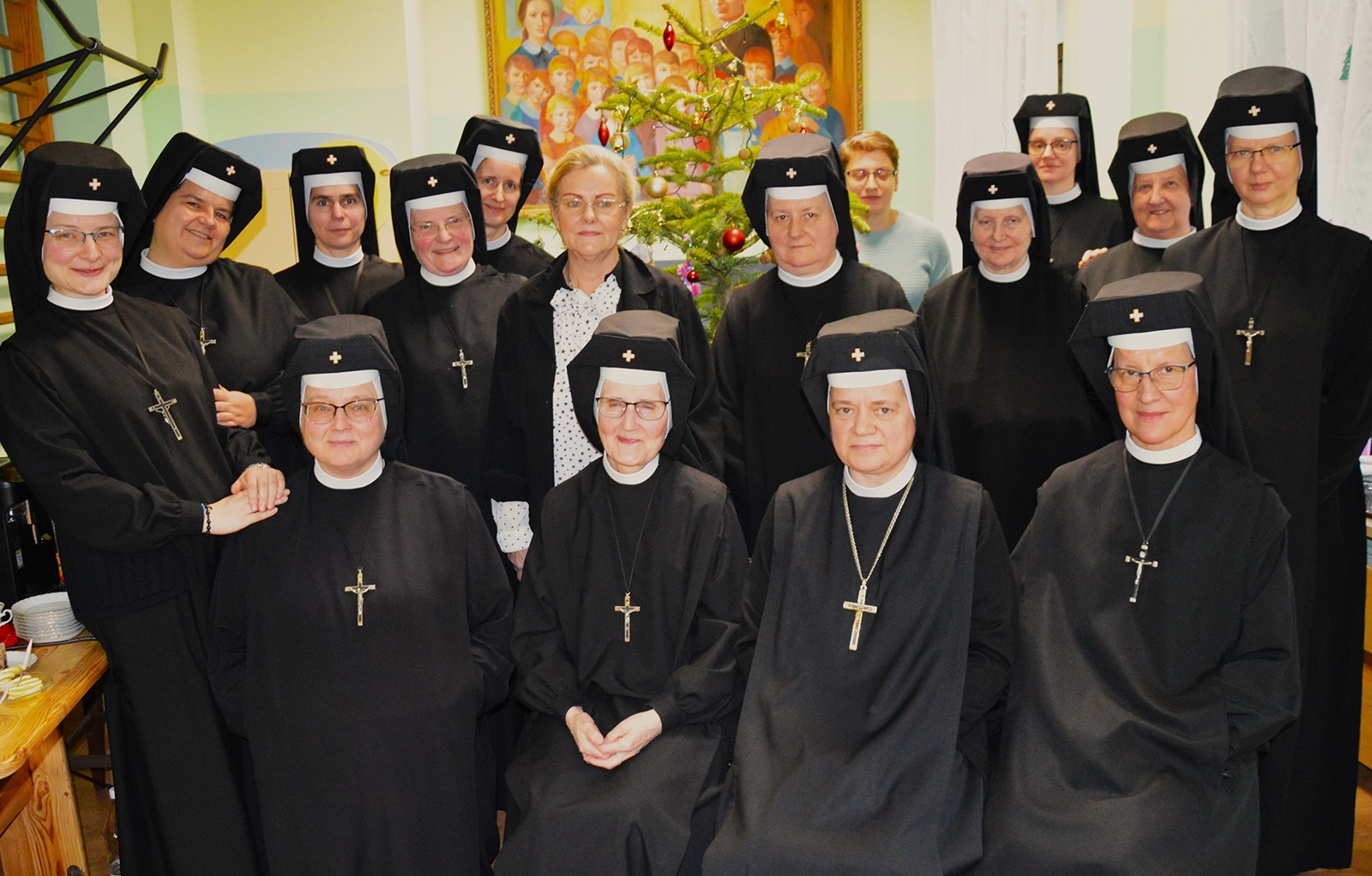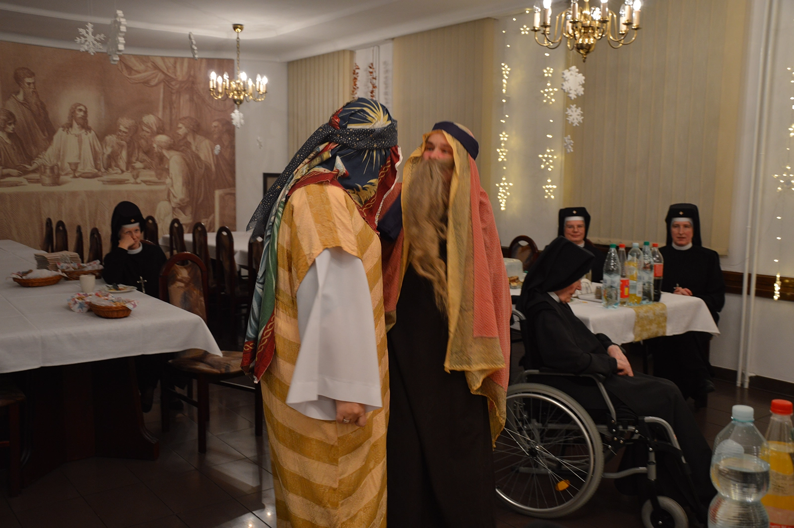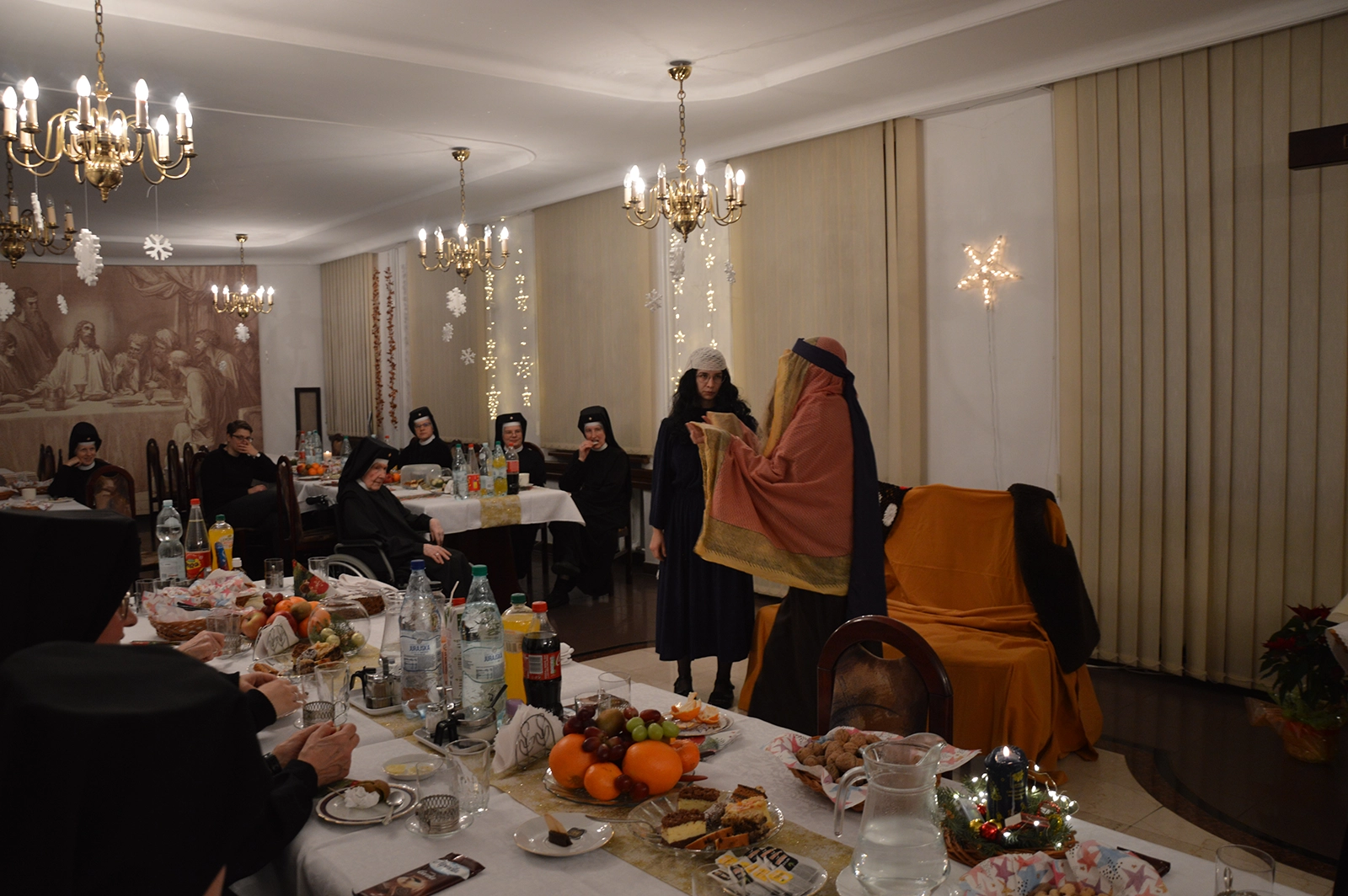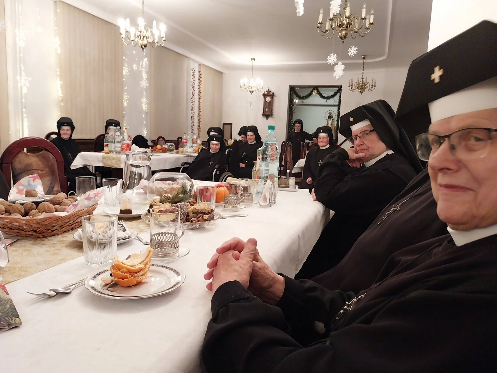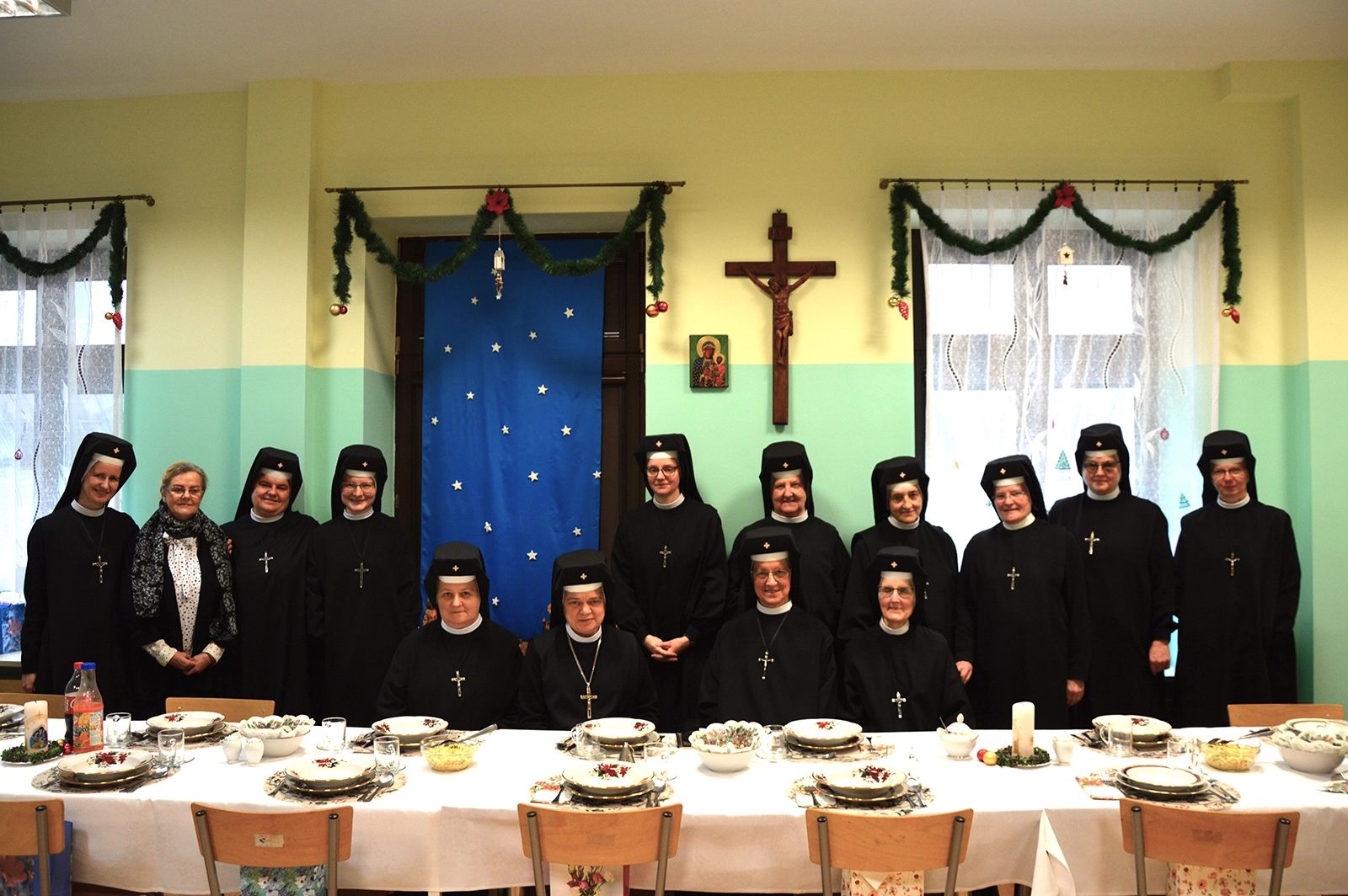 Wszystko wśród śpiewanych kolęd. Wyruszamy dość szybkim krokiem do kolejnych pomieszczeń klasztornych. Kolędy raz śpiewane głośniej, to niespodziewanie kilka sióstr odłączyło się od śpiewu, aby zamienić słowo, zażartować i jedna drugą chce rozśmieszyć. Udało się; wszystkie wybuchnęły śmiechem, ale idźmy dalej, ponieważ jest kilka, których pragnie, aby dalej śpiewać jeszcze głośniej, jeszcze bardziej sercem. Dobrze wiedzą, że to dopiero początek i jeszcze nie raz się roześmiejemy, ale wszystko po to, aby Bóg był uwielbiony w radości oraz cierpieniu. Jesteśmy razem dla Boga przez Maryję.