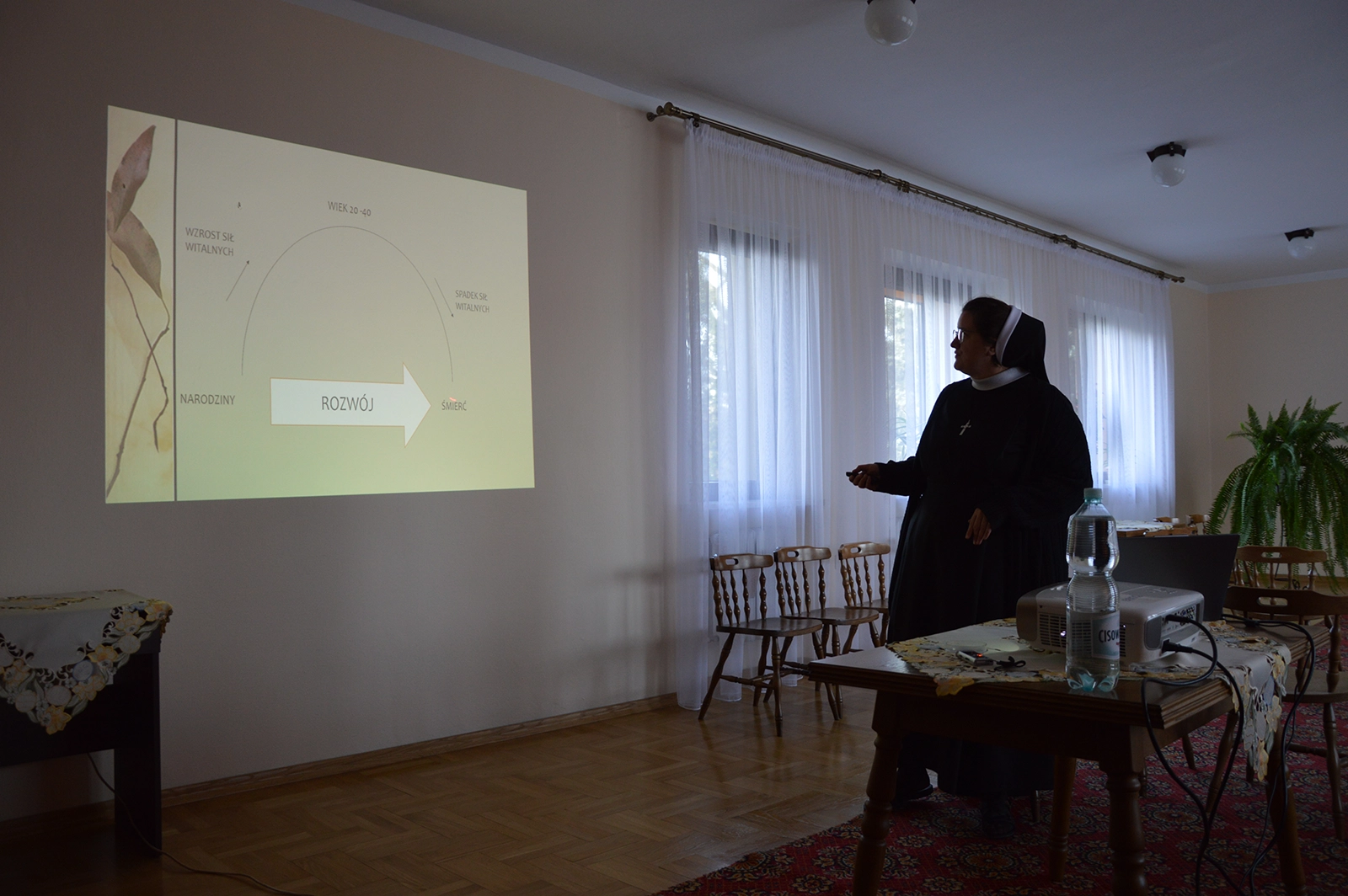 S. Stella – pielęgniarka z doświadczeniem pracy w infirmerii klasztornej, w przychodni, a obecnie również wykładowcy pielęgniarstwa geriatrycznego i fizjologii na UKSW, podzieliła się wiedzą z zakresu opieki nad osobami starszymi. Zwróciła uwagę na istotne elementy, takie jak: