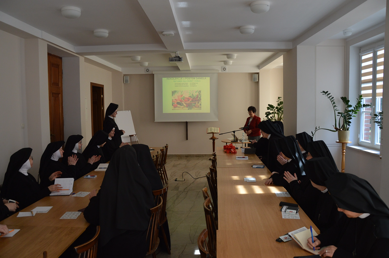 Wszystko rozpoczęło się o godz. 9.30 w sali nowicjatu słowem naszej Matki generalnej Brygidy Olędzkiej. Po nim miałyśmy krótką przerwę na kawę, a po niej o godz. 10.00 wykład z Urszulą Chmurą, która od 25 lat pracuje w żywieniu. Był też obecny pan Romek, asystent pani Urszuli.