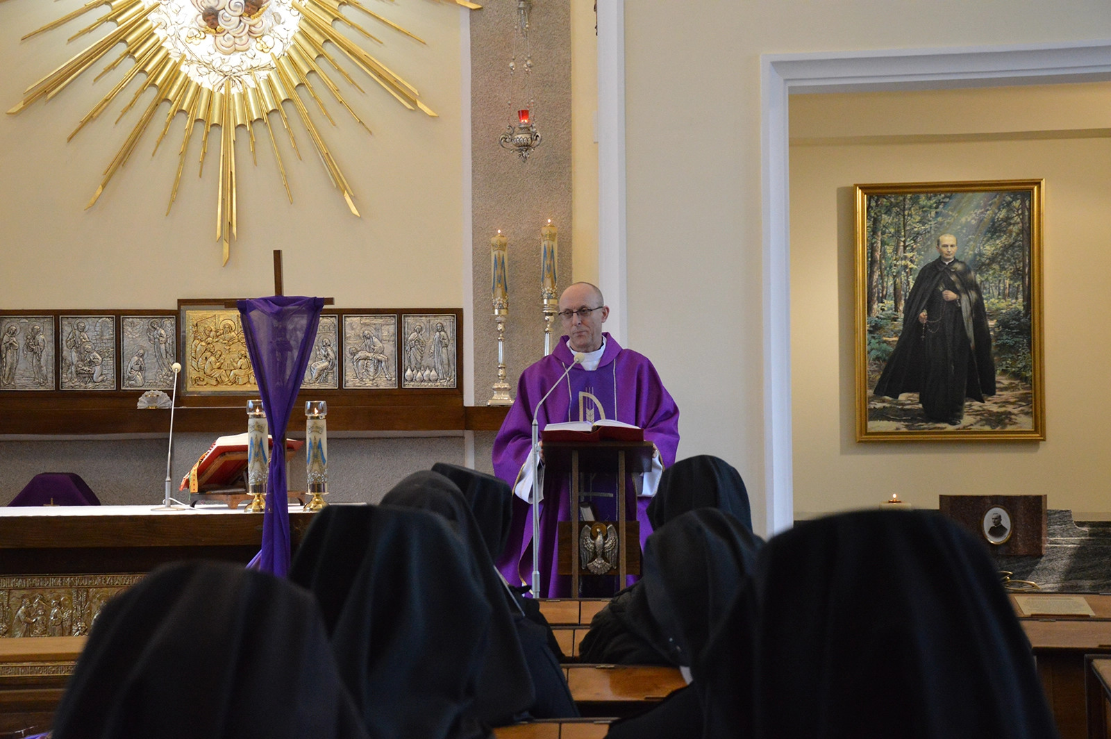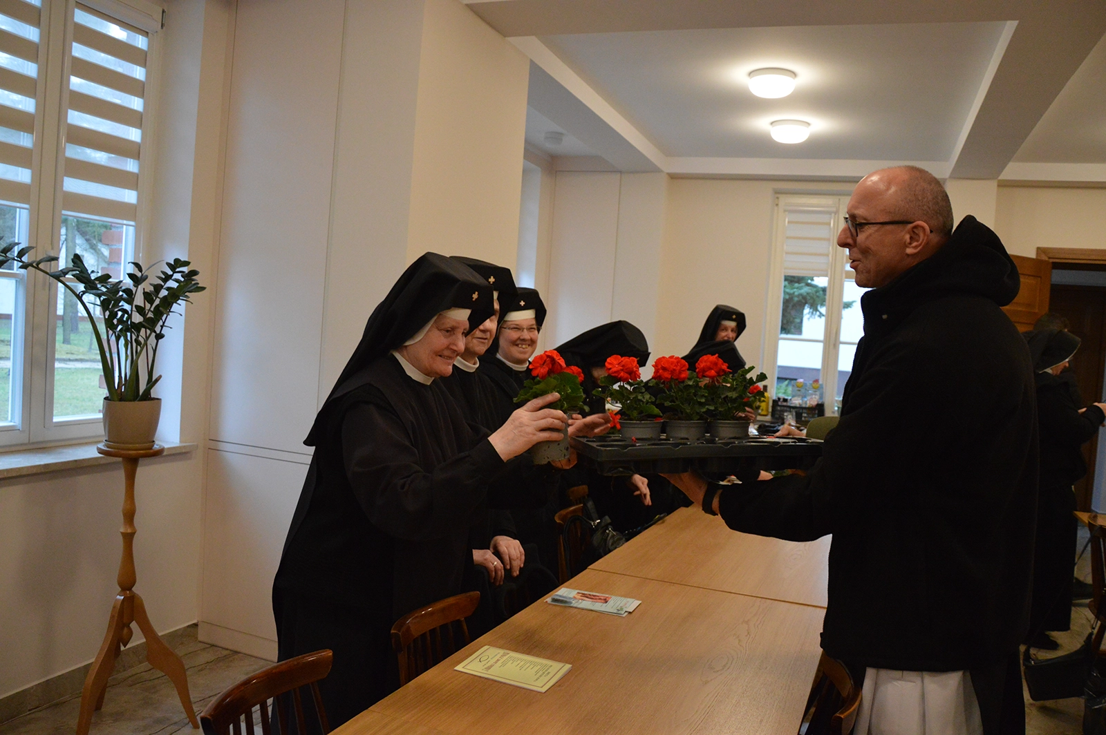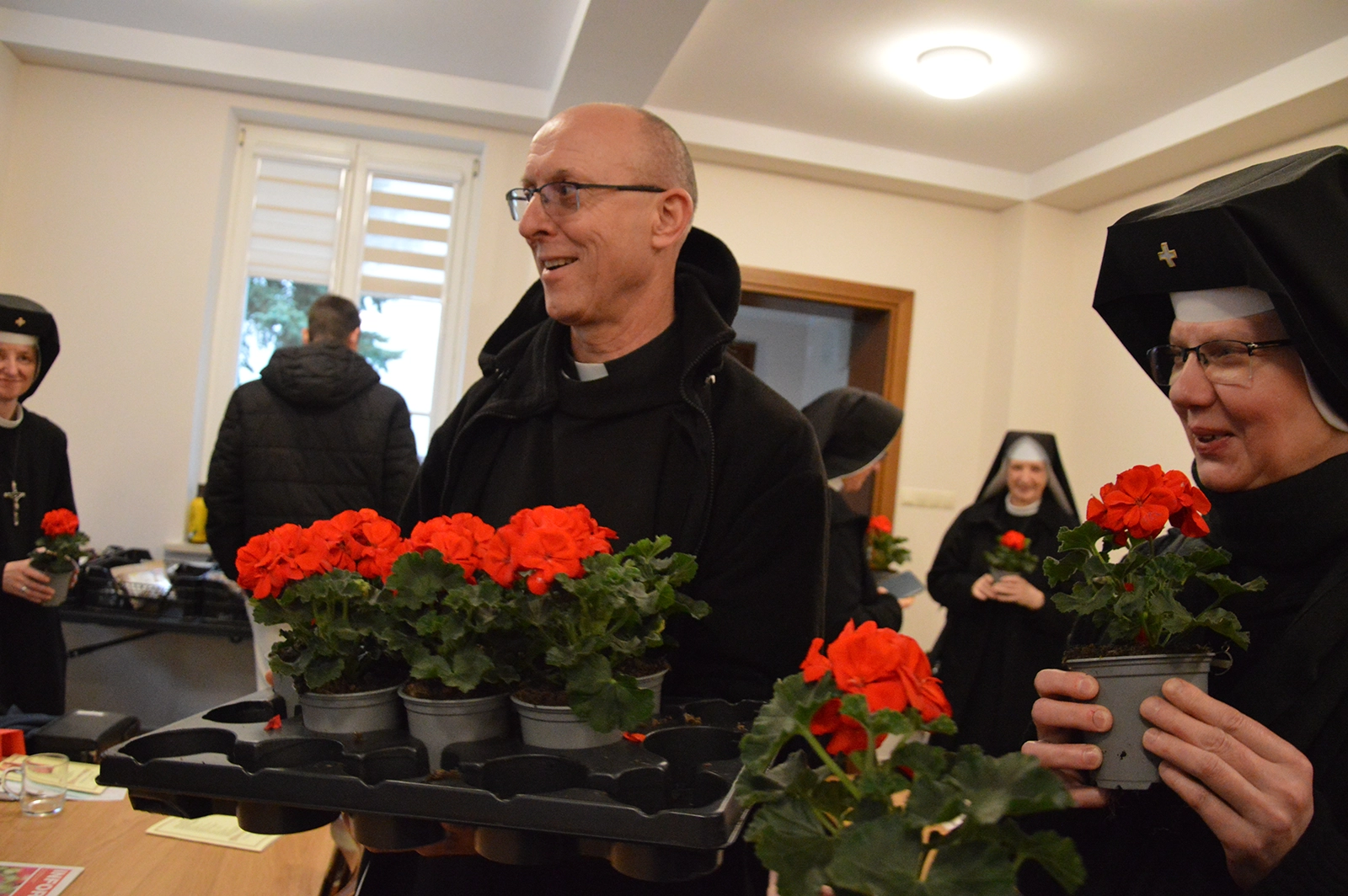 O godz. 15.00 Koronka do Bożego Miłosierdzia i Eucharystia, której przewodniczył o. Rajmund Guzik OCist. Po Mszy świętej powróciłyśmy do sali nowicjatu, gdzie mogłyśmy nabyć zdrowe produkty i jeszcze spotkać się przy kawie i ciastku oraz doświadczyłyśmy wielu niespodzianek od o. Rajmunda.
