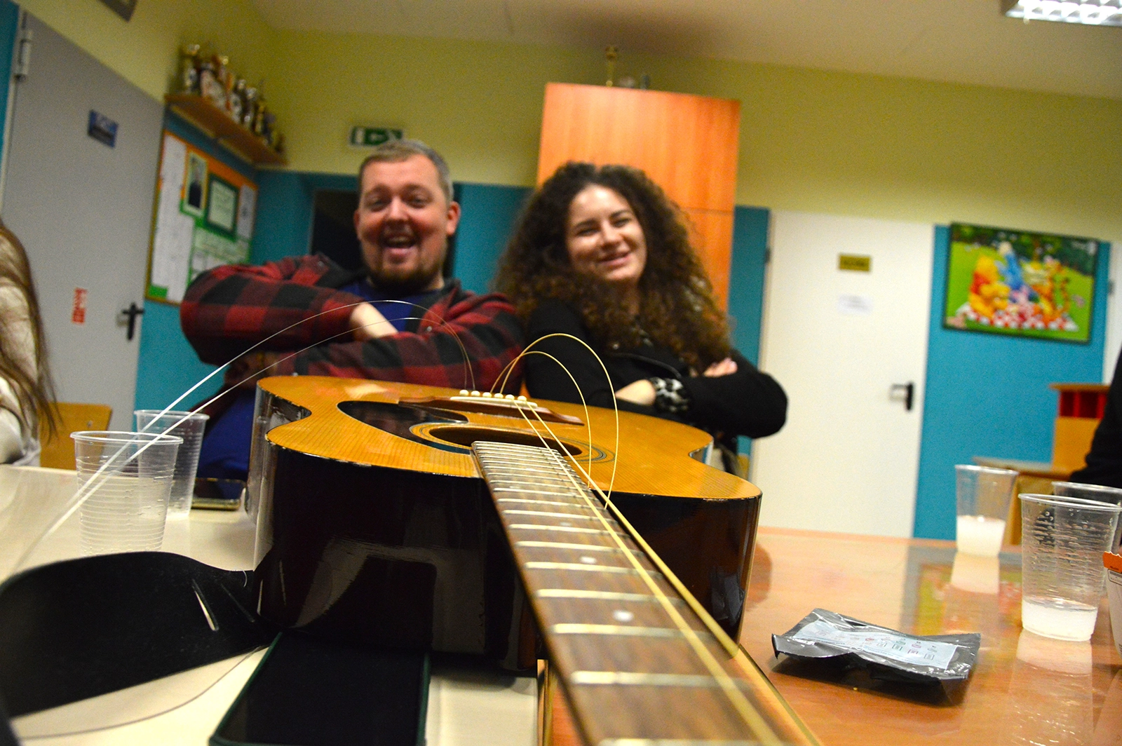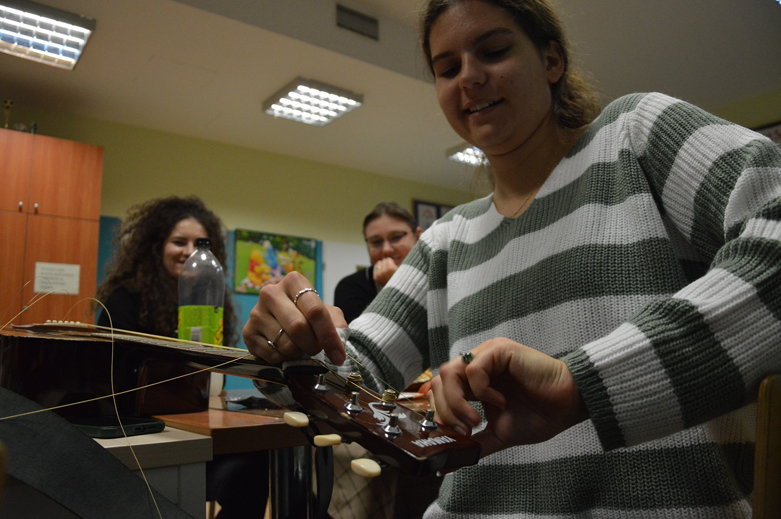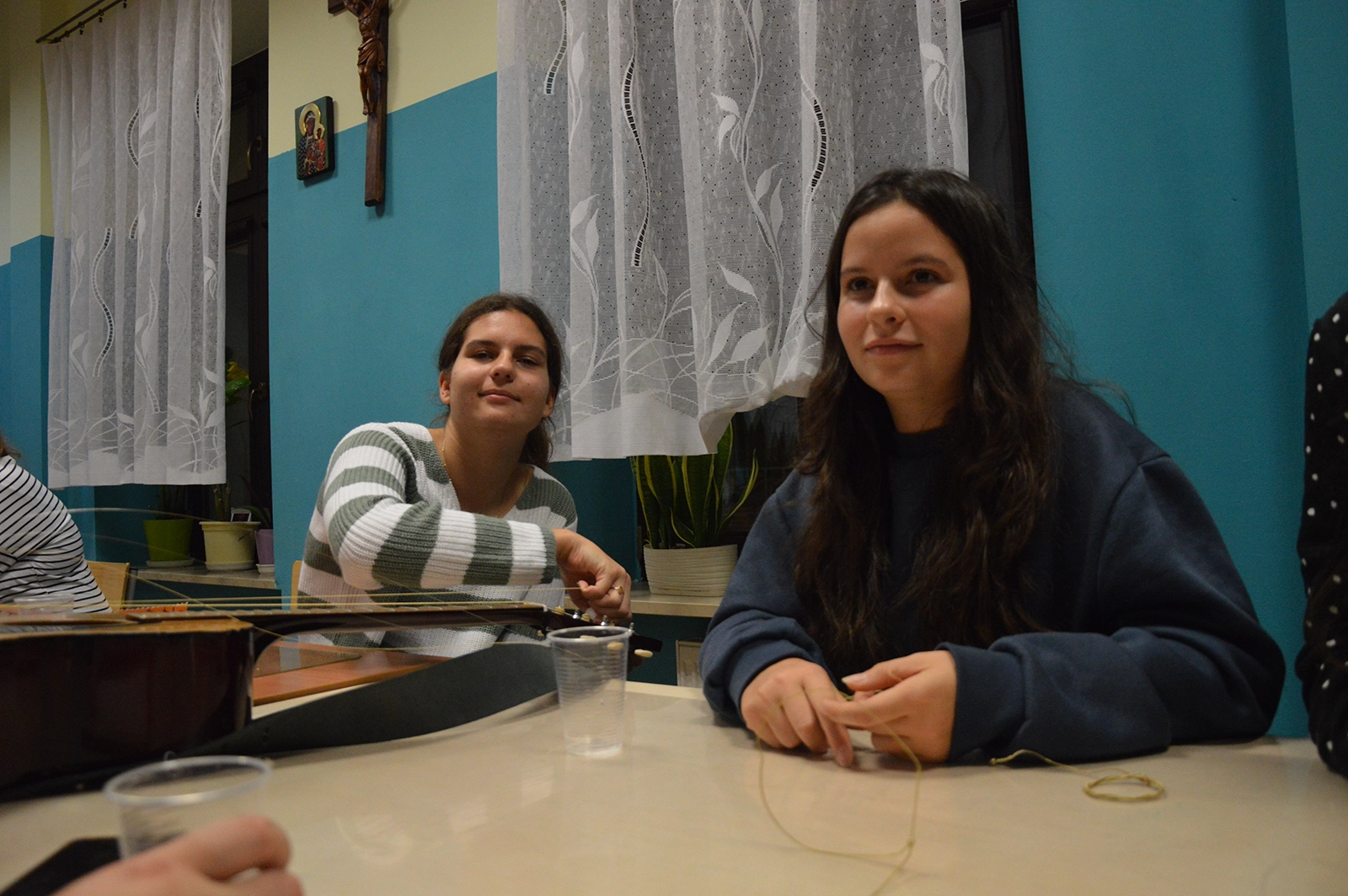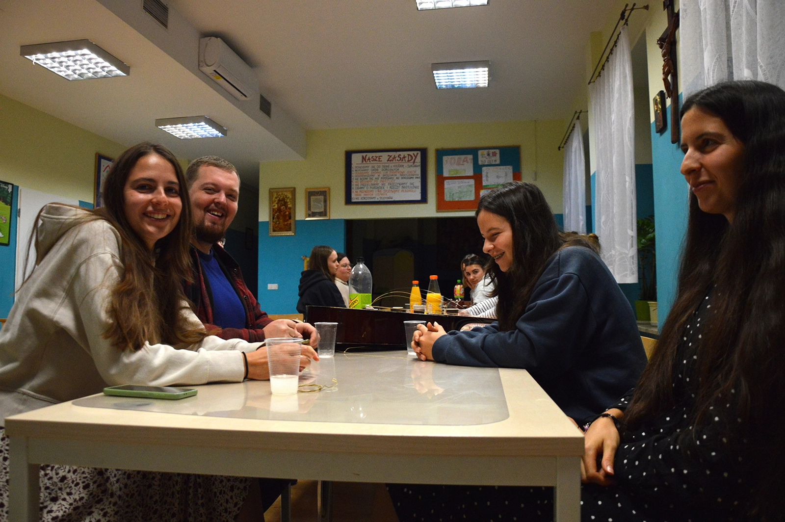 Później przyszedł czas na rozmowy i wspólne bycie razem po wakacyjnej przerwie. Dzieliliśmy się tym, co wydarzyło się w naszym życiu, co się zmieniło i co dziś jest dla nas ważne. Nie zabrakło radości – graliśmy w piłkarzyki, wymienialiśmy struny w gitarze i zajadaliśmy się pysznymi ciastkami. Do naszej wspólnoty dołączyły też nowe osoby, które z radością przyjęliśmy w nasze grono. To był piękny czas – pełen modlitwy, radości, rozmów i wspólnoty. Każde spotkanie przypomina nam, że wiara to nie tylko słowa, lecz żywa relacja z Jezusem, której uczymy się razem z Maryją.